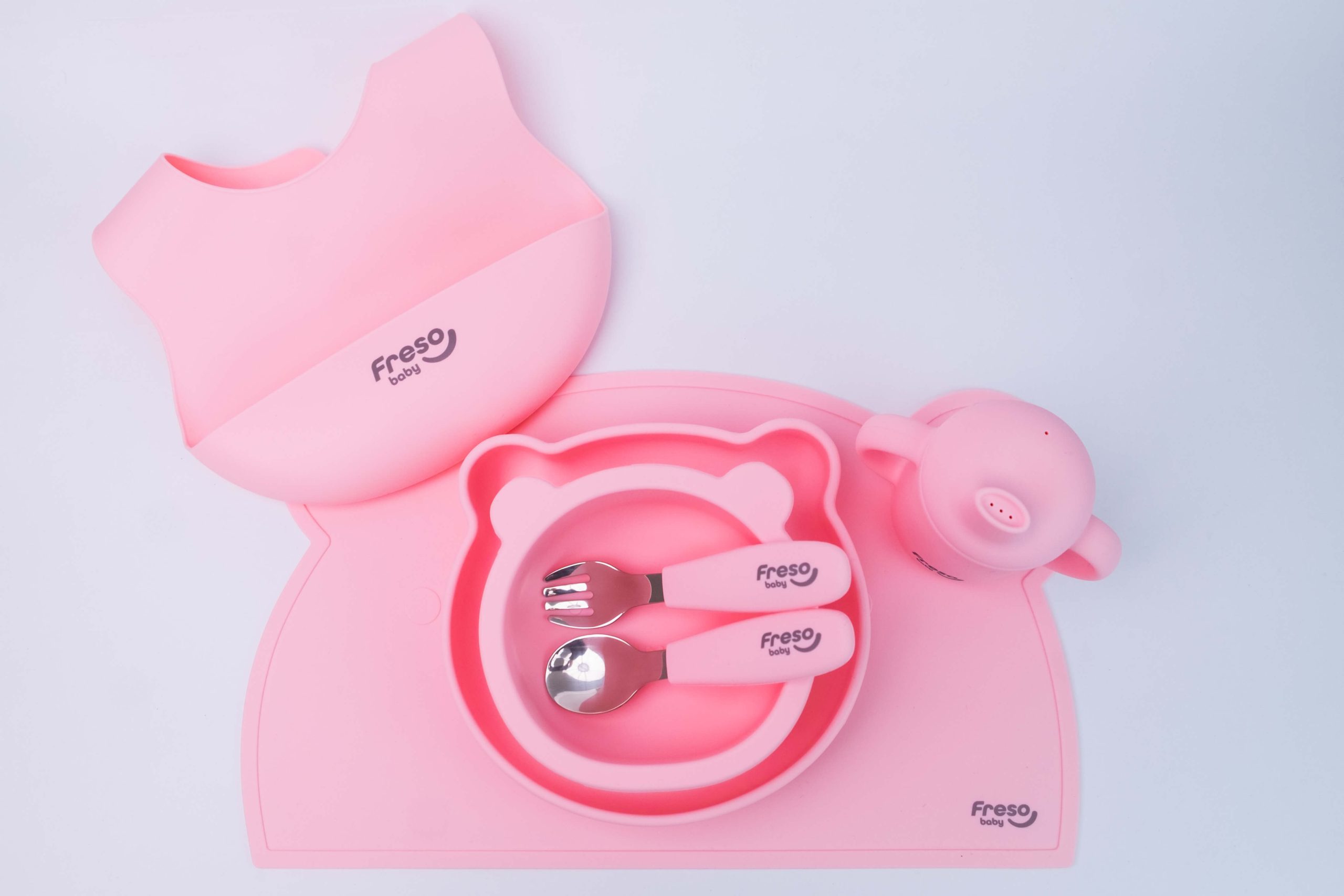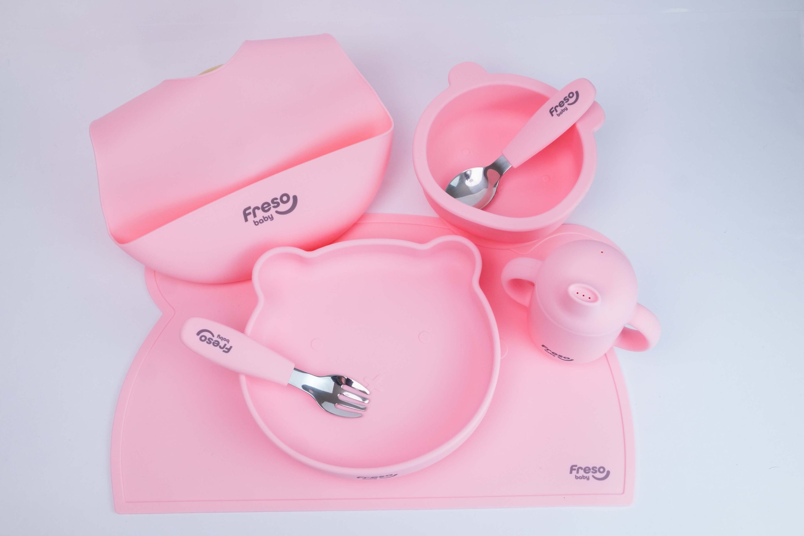 Até 100 caracteres: Freso Baby Kit Alimentação de Bebê Silicone Livre BPA Introdução Alimentar BLW 7 Peças Urso Rosa