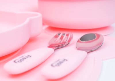 Feitos em silicone de grau alimentício, atóxicos, livres de BPA e aço inoxidável. Enquanto o silicone proporciona resistência ao calor, o aço inoxidável garante durabilidade e alta qualidade que mantêm a segurança do bebê em todas as refeições. Disponíveis nas cores Rosa e Cinza.