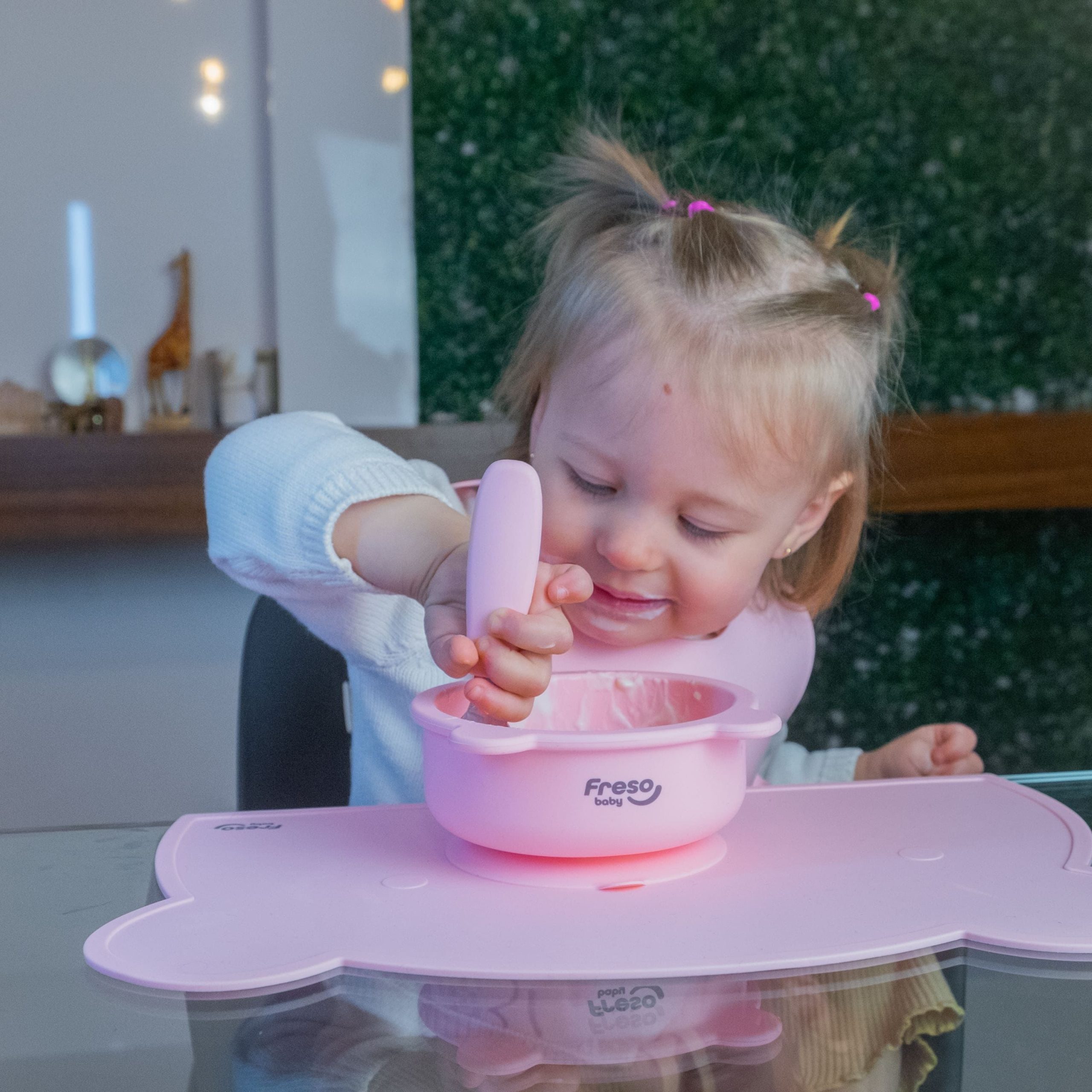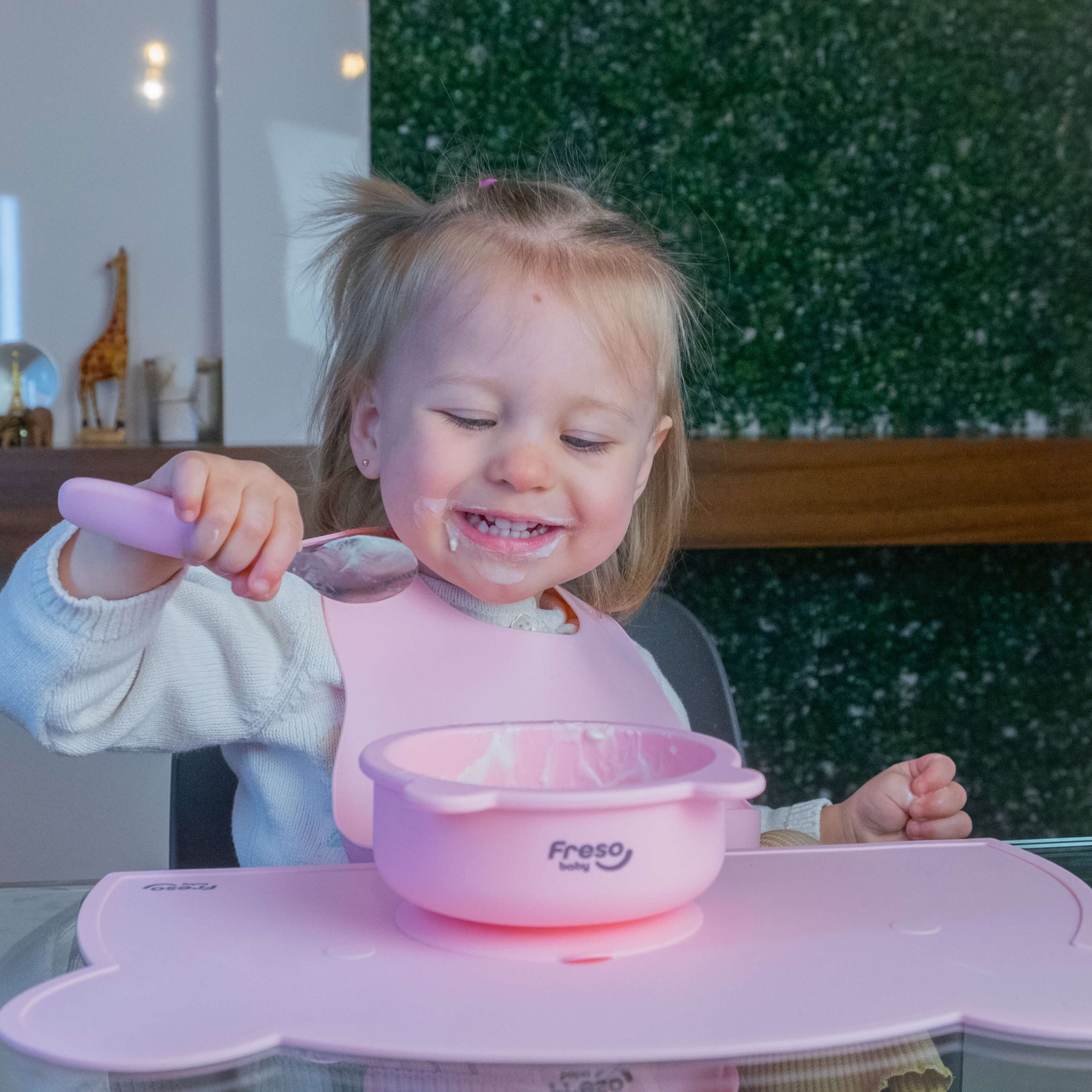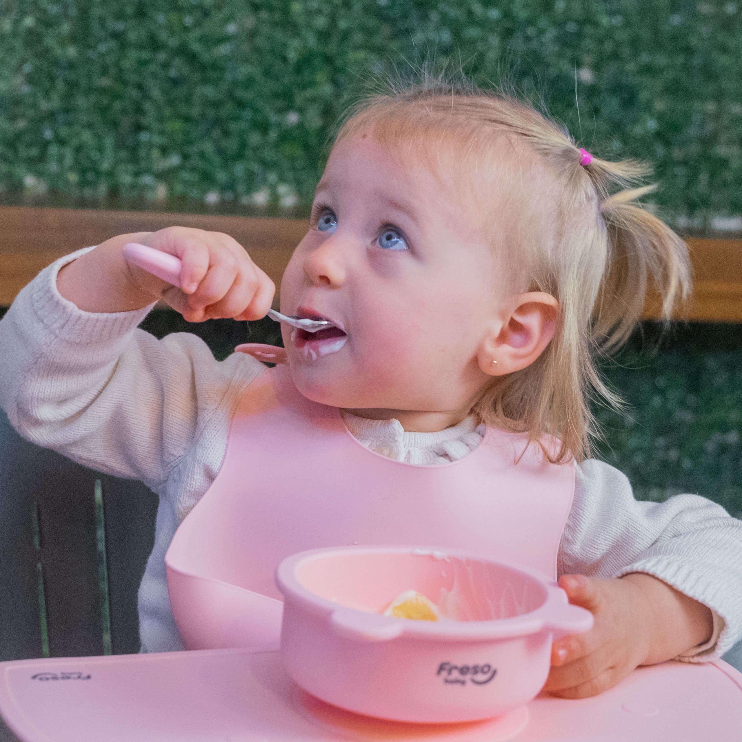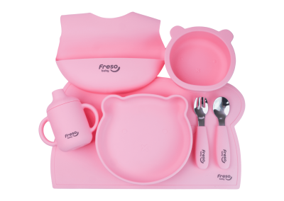 Até 150 caracteres: Freso Baby Kit Alimentação de Bebê Silicone Atóxico Livre de BPA Introdução Alimentar BLW Pratinhos Babador Talheres Completo 7 Peças Urso Rosa