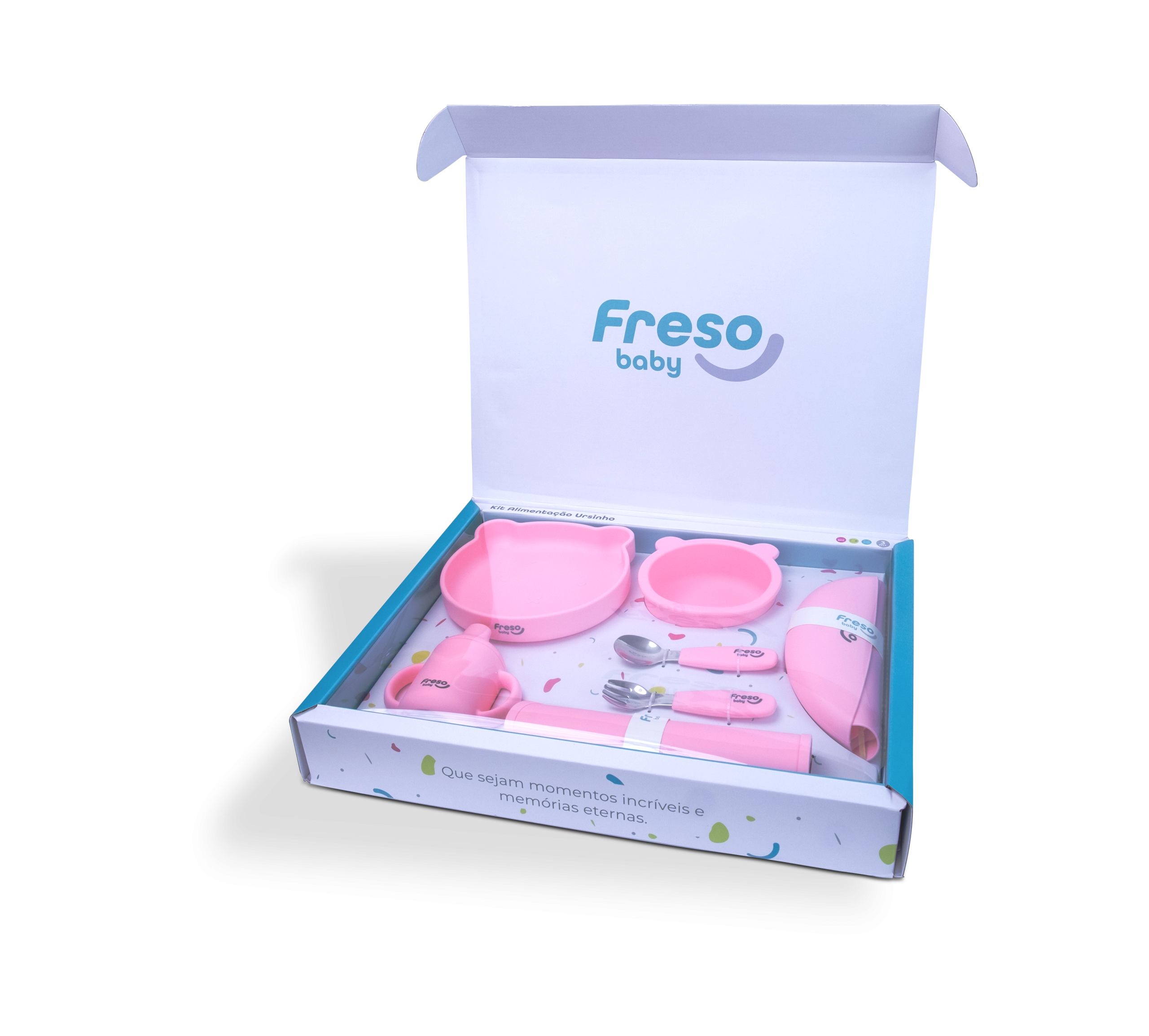 Até 100 caracteres: Freso Baby Kit Alimentação Bebê Silicone Free BPA Introdução Alimentar Completo 7 Peças Urso Rosa