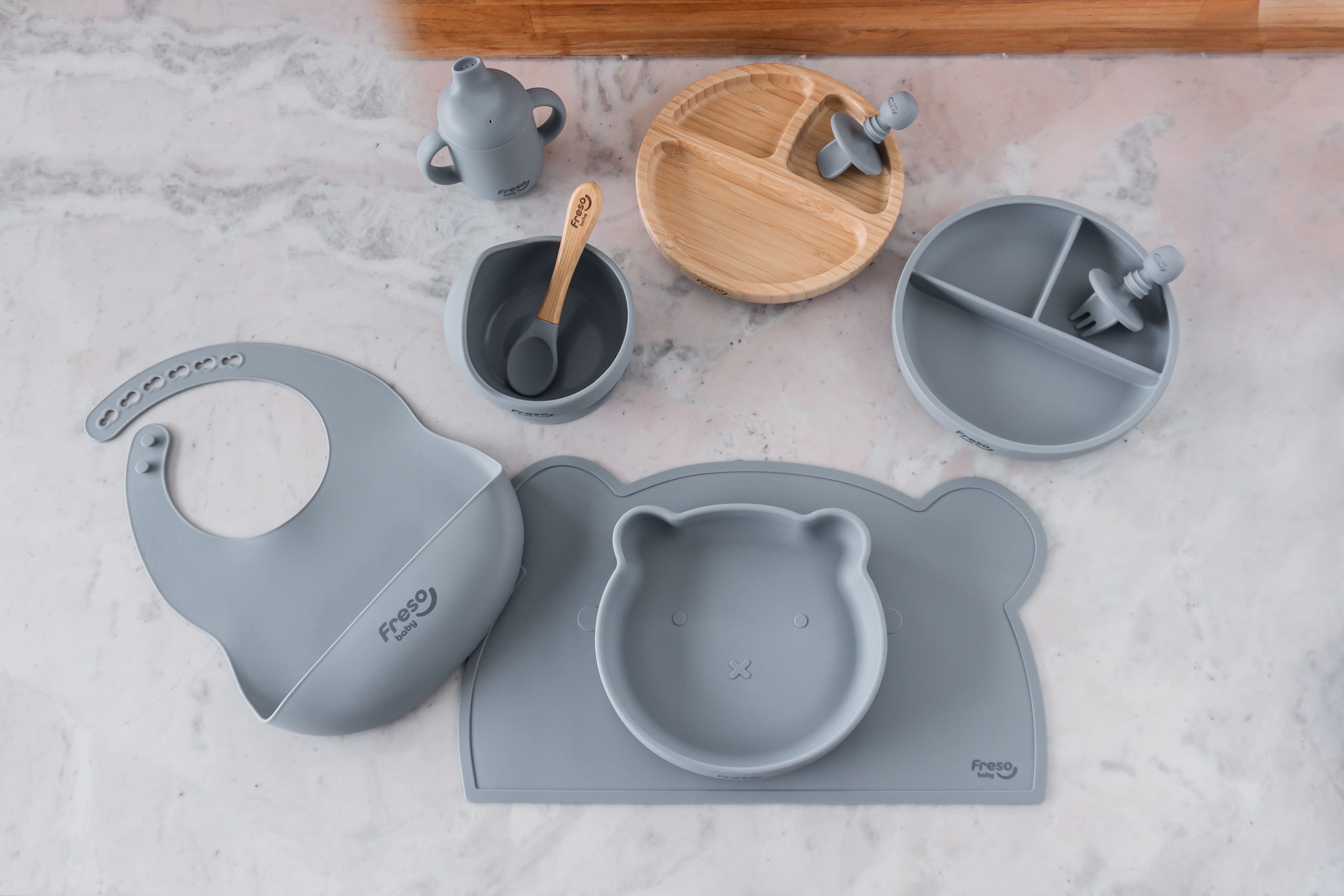 Até 100 caracteres: Freso Baby Babador Silicone Alimentação Bebê BLW Bolso Pega Migalhas Fecho Ajustável Livre BPA Cinza