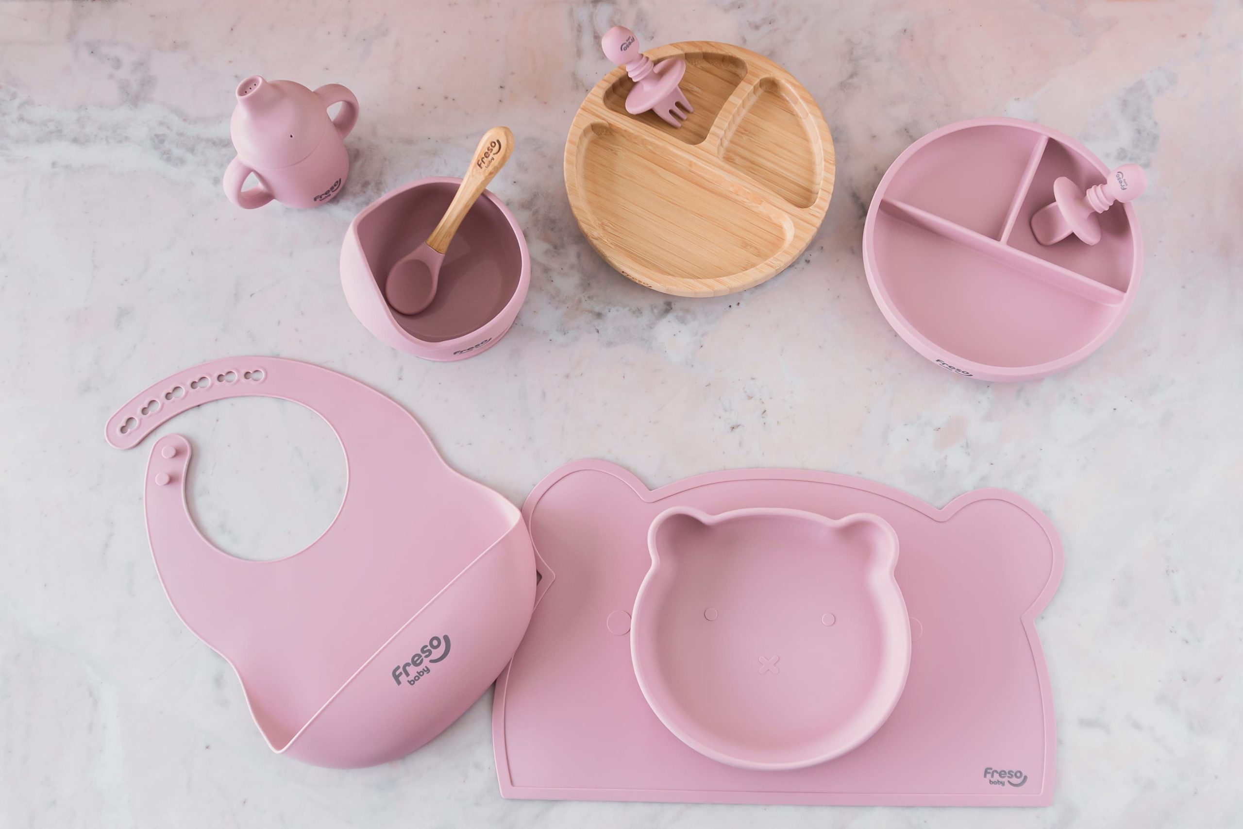 Até 100 caracteres: Freso Baby Babador Silicone Alimentação Bebê BLW Bolso Pega Migalhas Fecho Ajustável Livre BPA Rosa