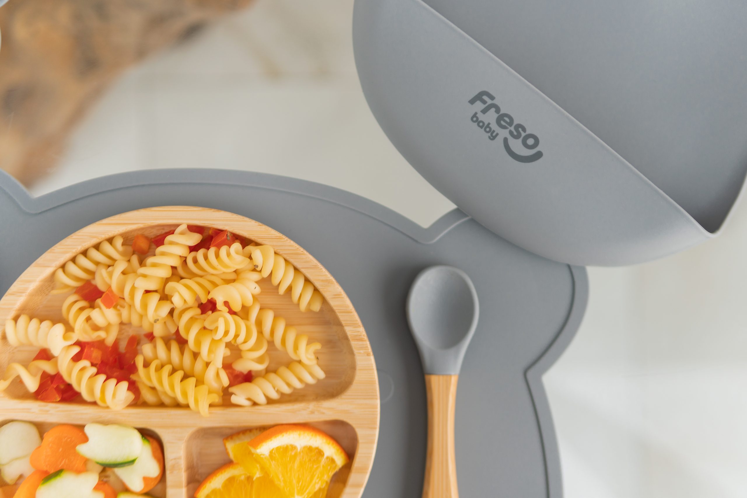 Até 100 caracteres: Freso Baby Colher Alimentação Infantil Silicone Livre BPA e Bambu Introdução Alimentar Bebê Cinza