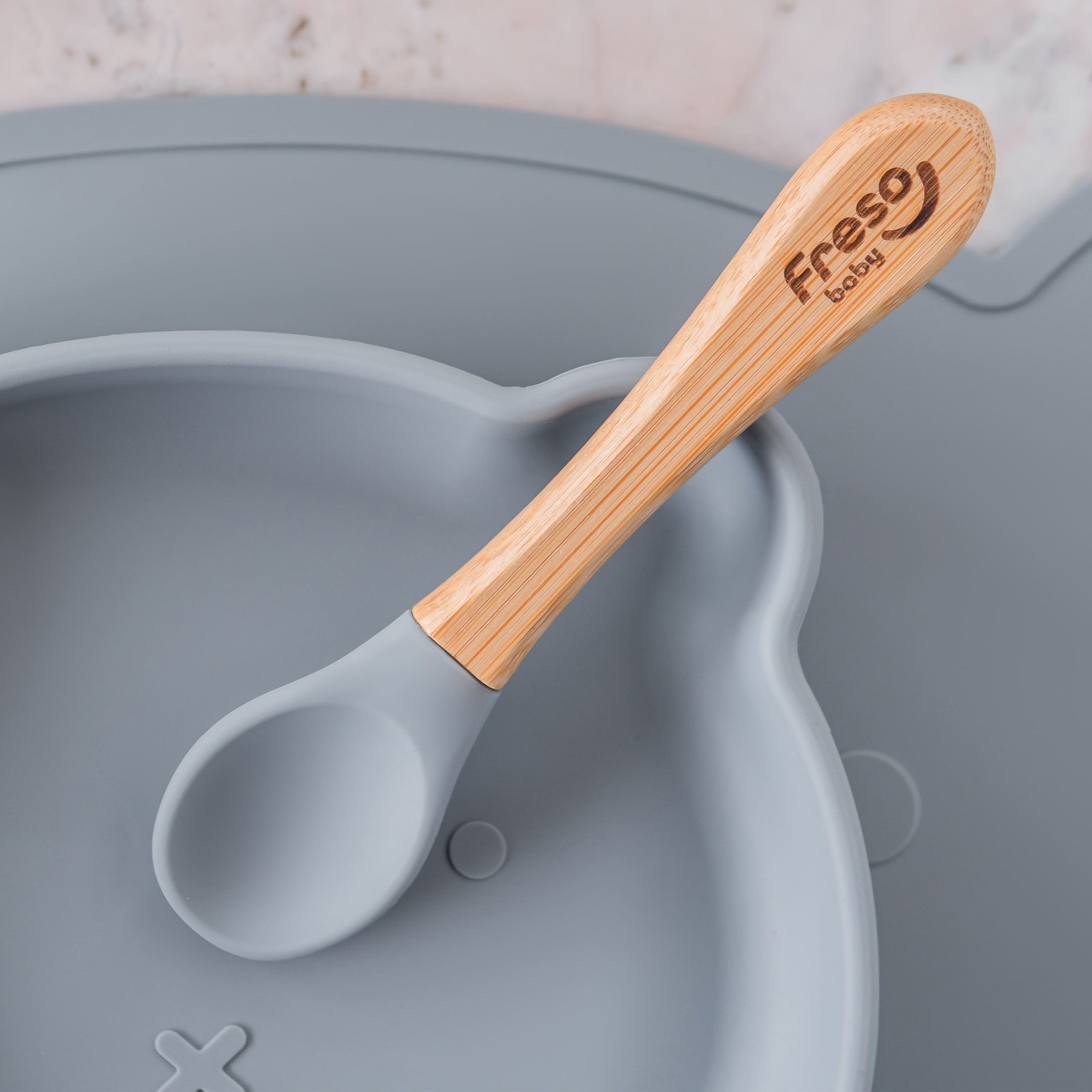 Até 200 caracteres: Freso Baby Colher Alimentação de Bebê Silicone de Grau Alimentício Livre de BPA Atóxico e Bamboo Orgânico Antibacteriano Talher Treinamento Introdução Alimentar Infantil BLW Refeição Criança Cinza