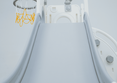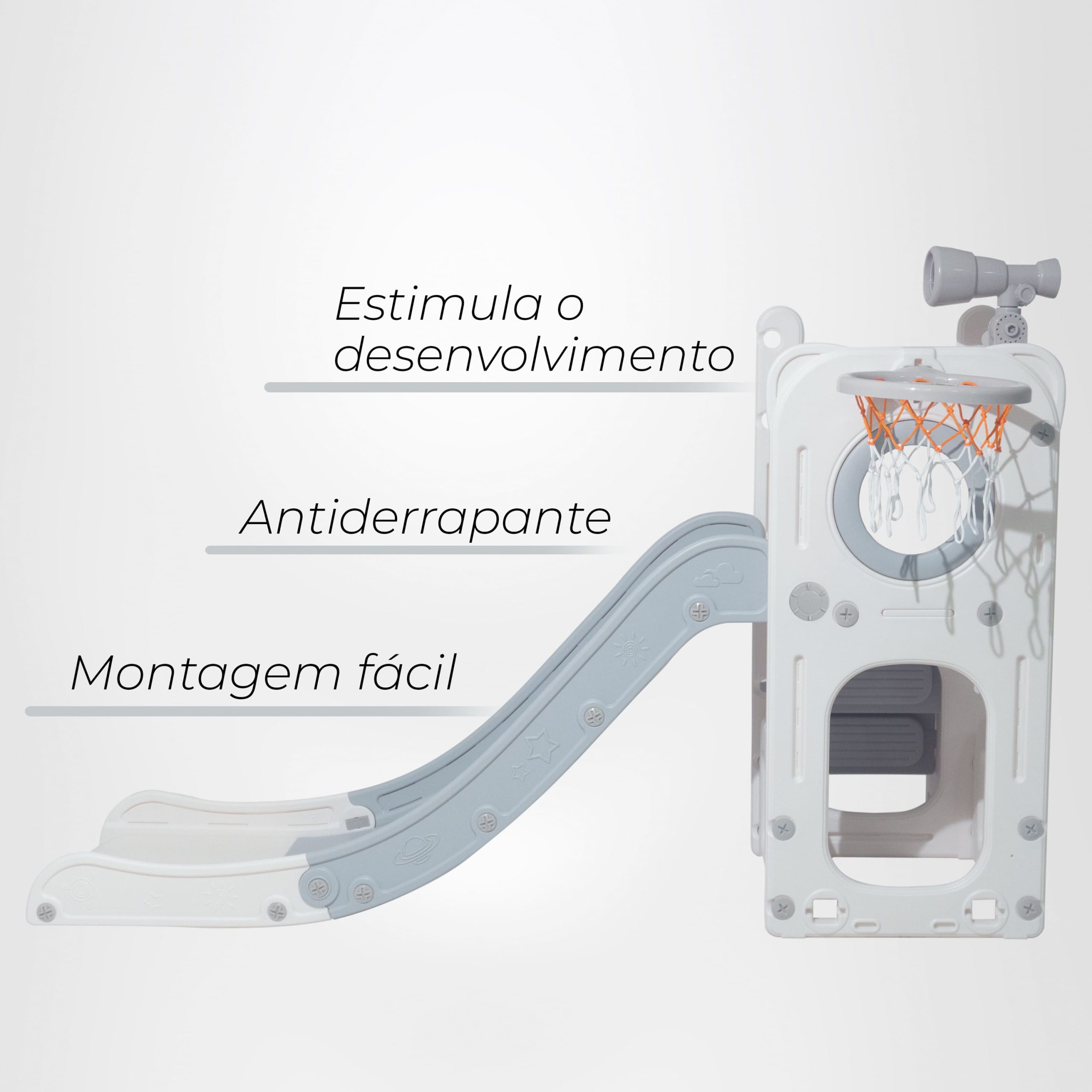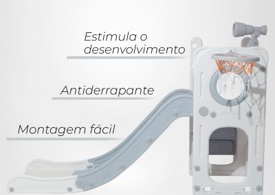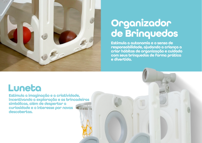Com 1 torre que inclui escorregador, cesta de basquete, luneta e guarda-brinquedos. Este playground oferece diversas atividades que estimulam a criatividade e o desenvolvimento motor dos pequenos. Feito com materiais de alta qualidade e cantos arredondados, é ideal para ambientes internos e externos e é fácil de montar.