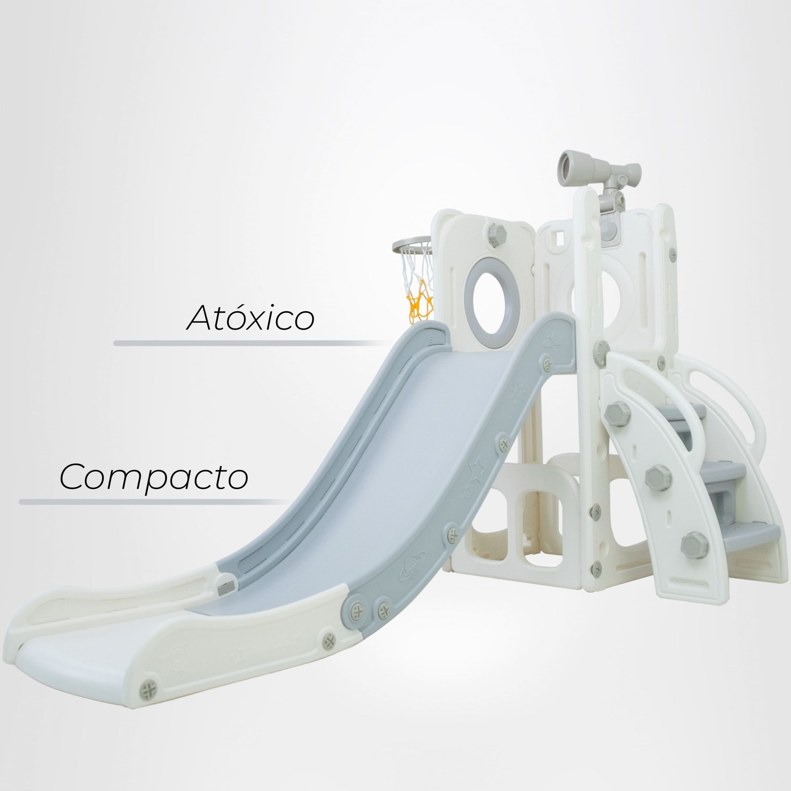 Freso Baby  Playground Infantil Mini Mundo Grey 1 Torre, Playground Compacto e Versátil com Escorregador, Cesta de Basquete, Escalada, Luneta e Atividades Interativas. Ideal para Desenvolvimento Infantil de Crianças Pequenas de 1 a 4 Anos