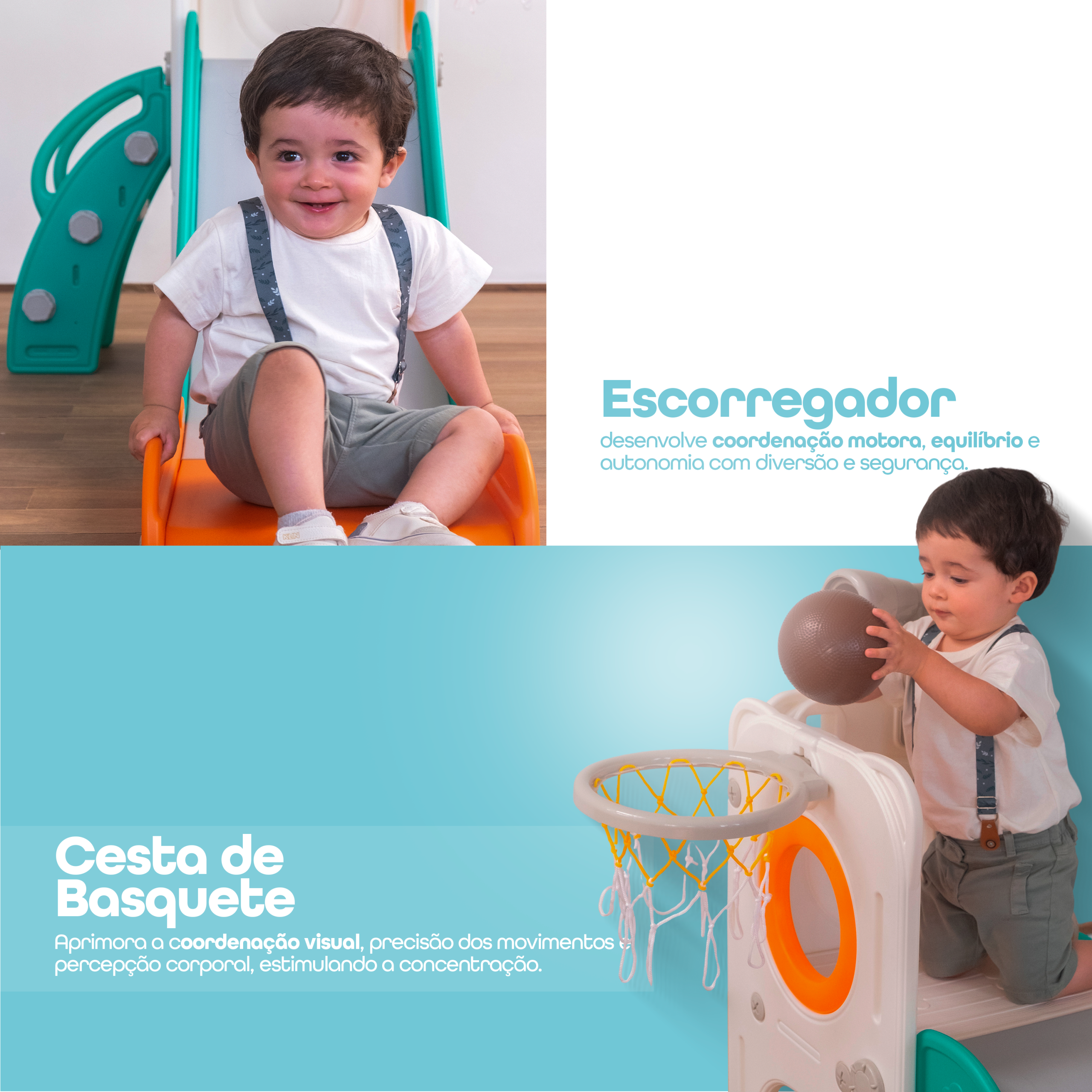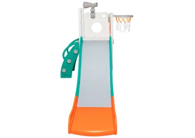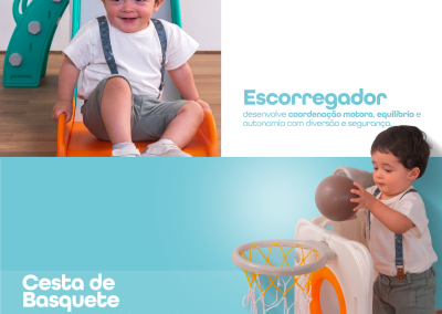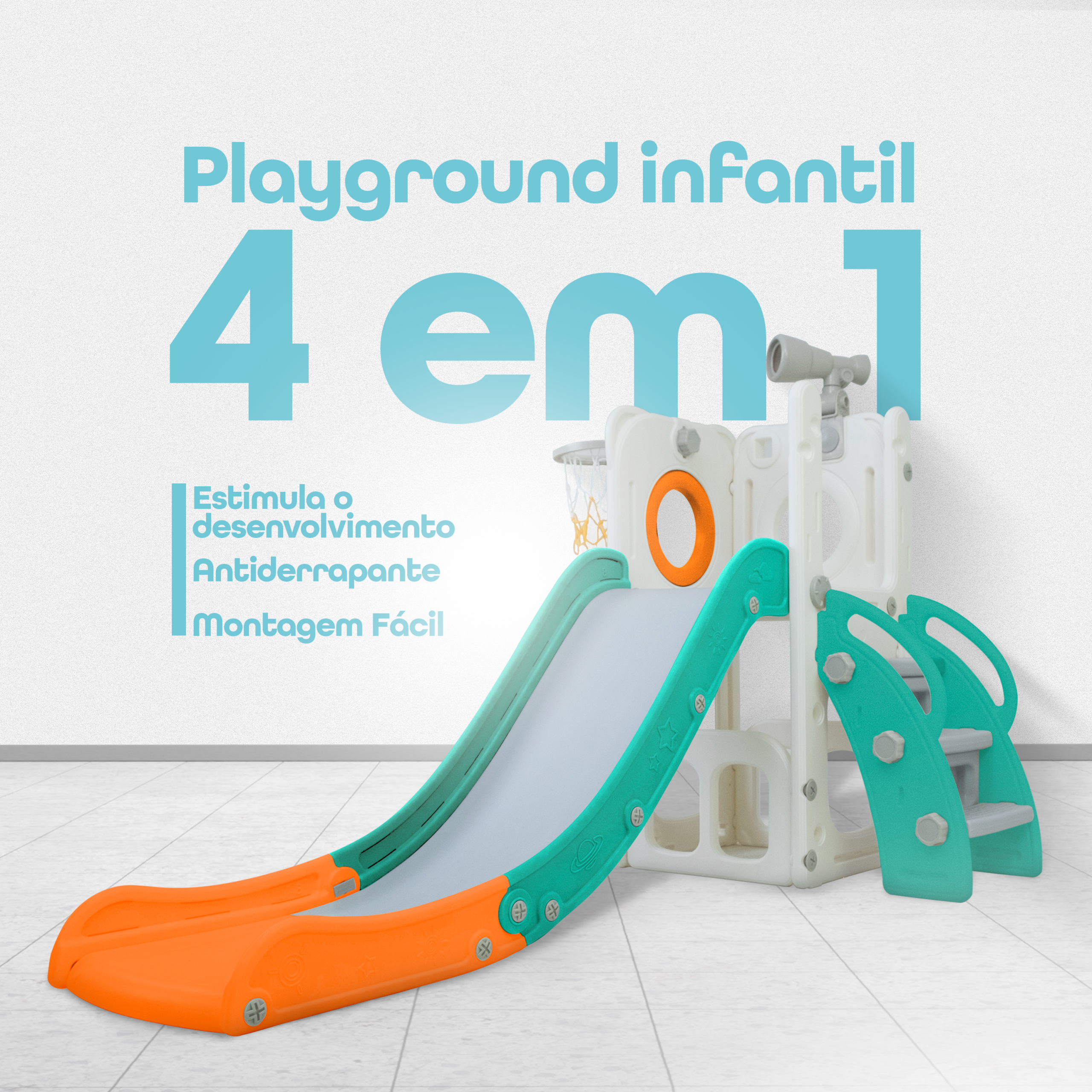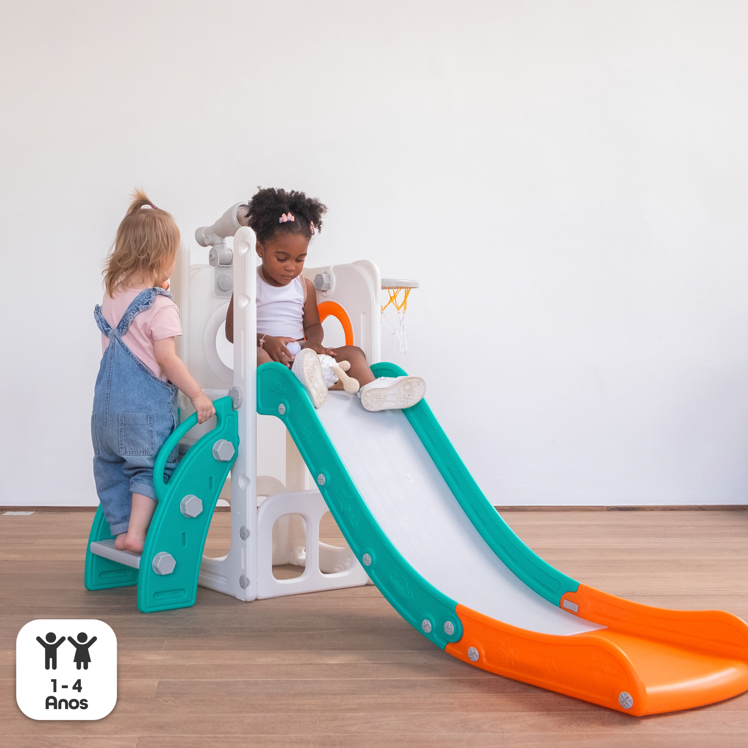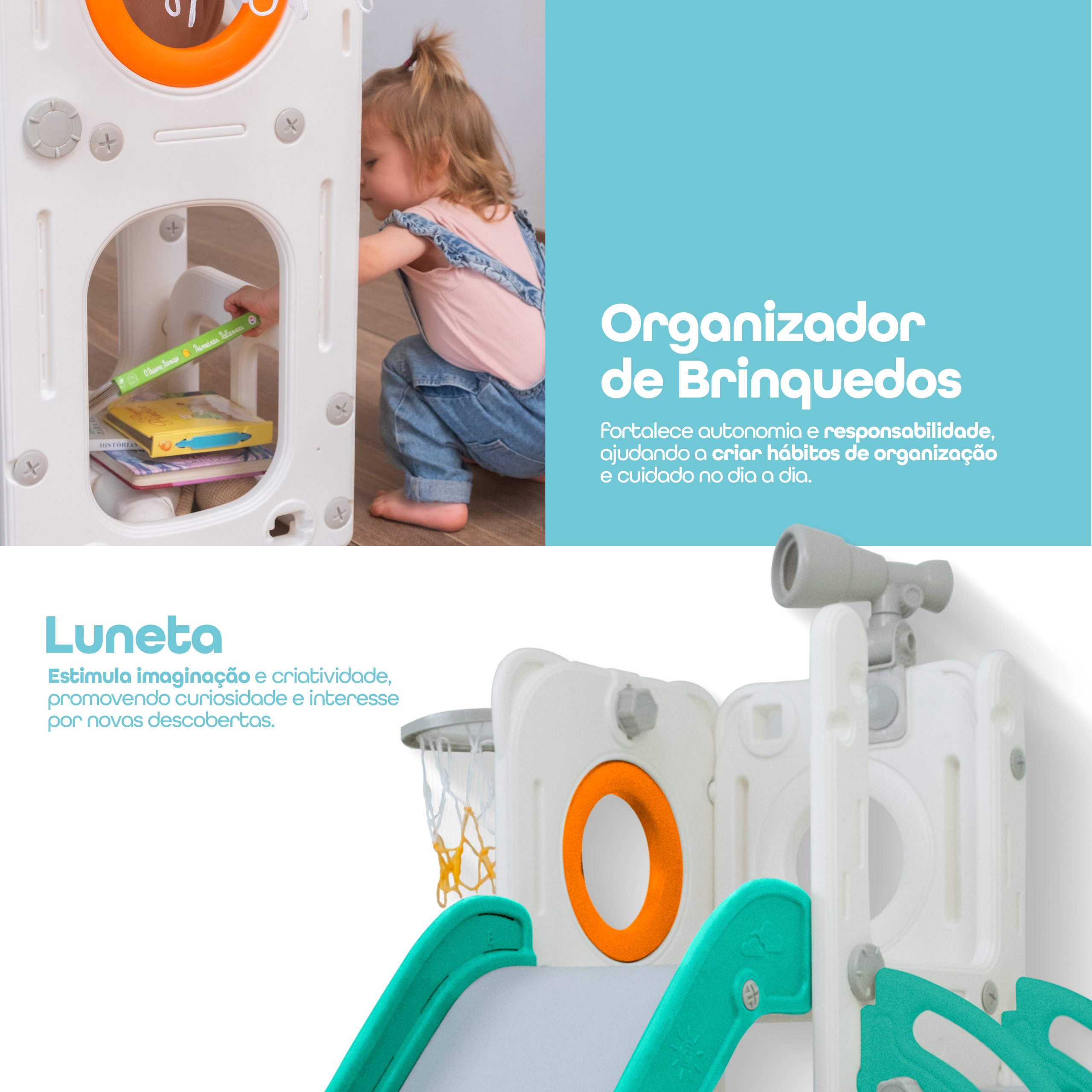 Com 1 torre que inclui escorregador, cesta de basquete, luneta e guarda-brinquedos. Este playground oferece diversas atividades que estimulam a criatividade e o desenvolvimento motor dos pequenos. Feito com materiais de alta qualidade e cantos arredondados, é ideal para ambientes internos e externos e é fácil de montar.