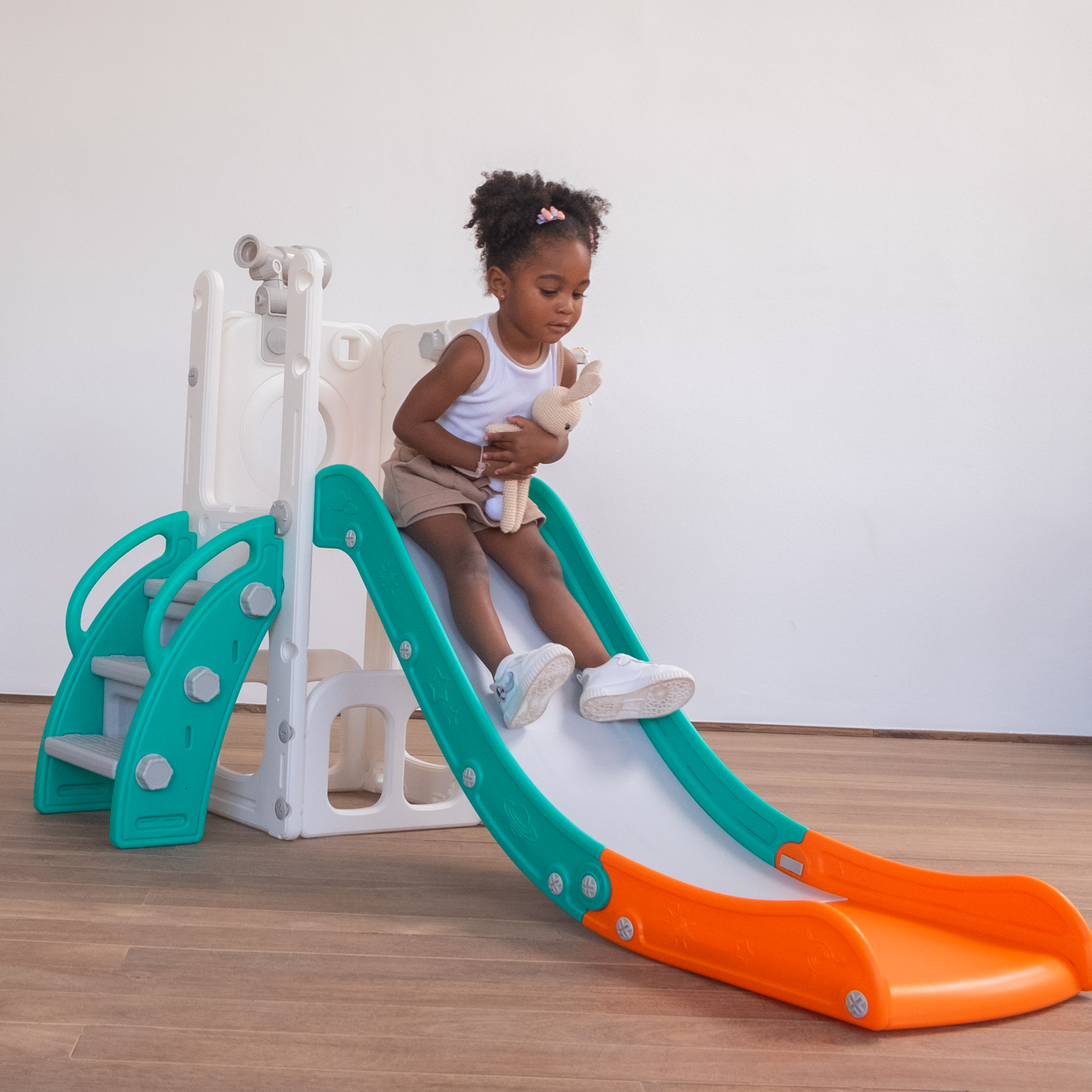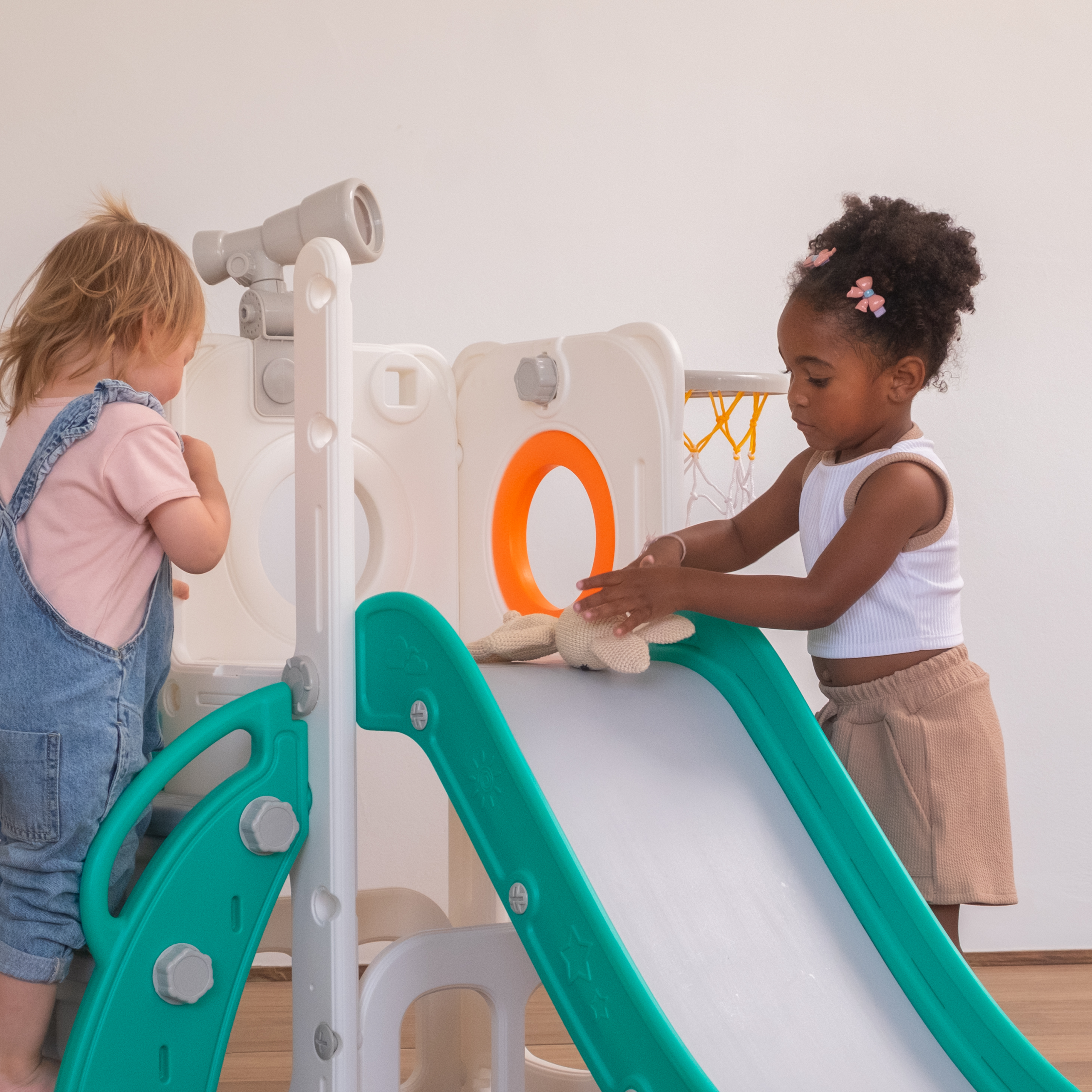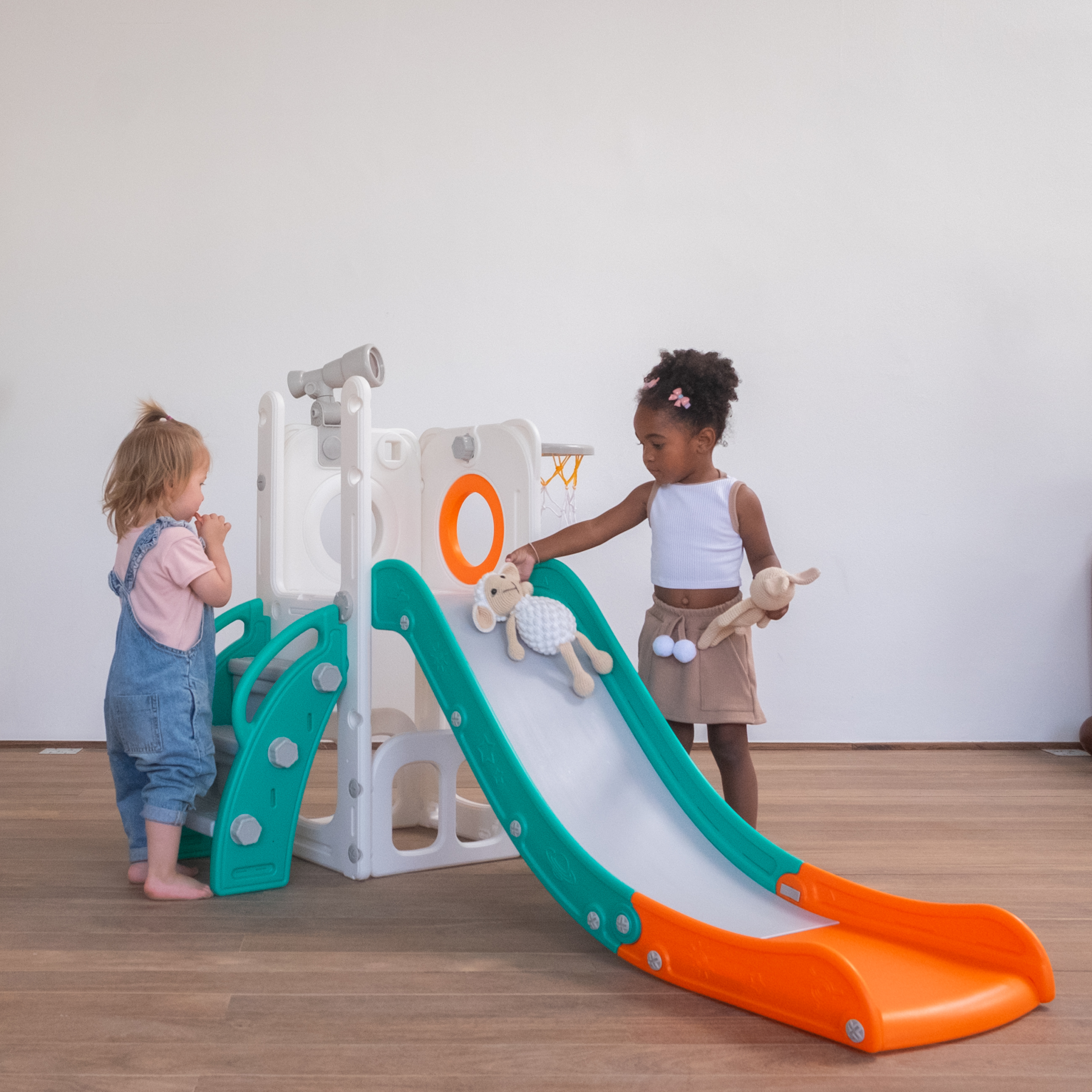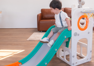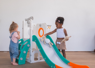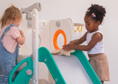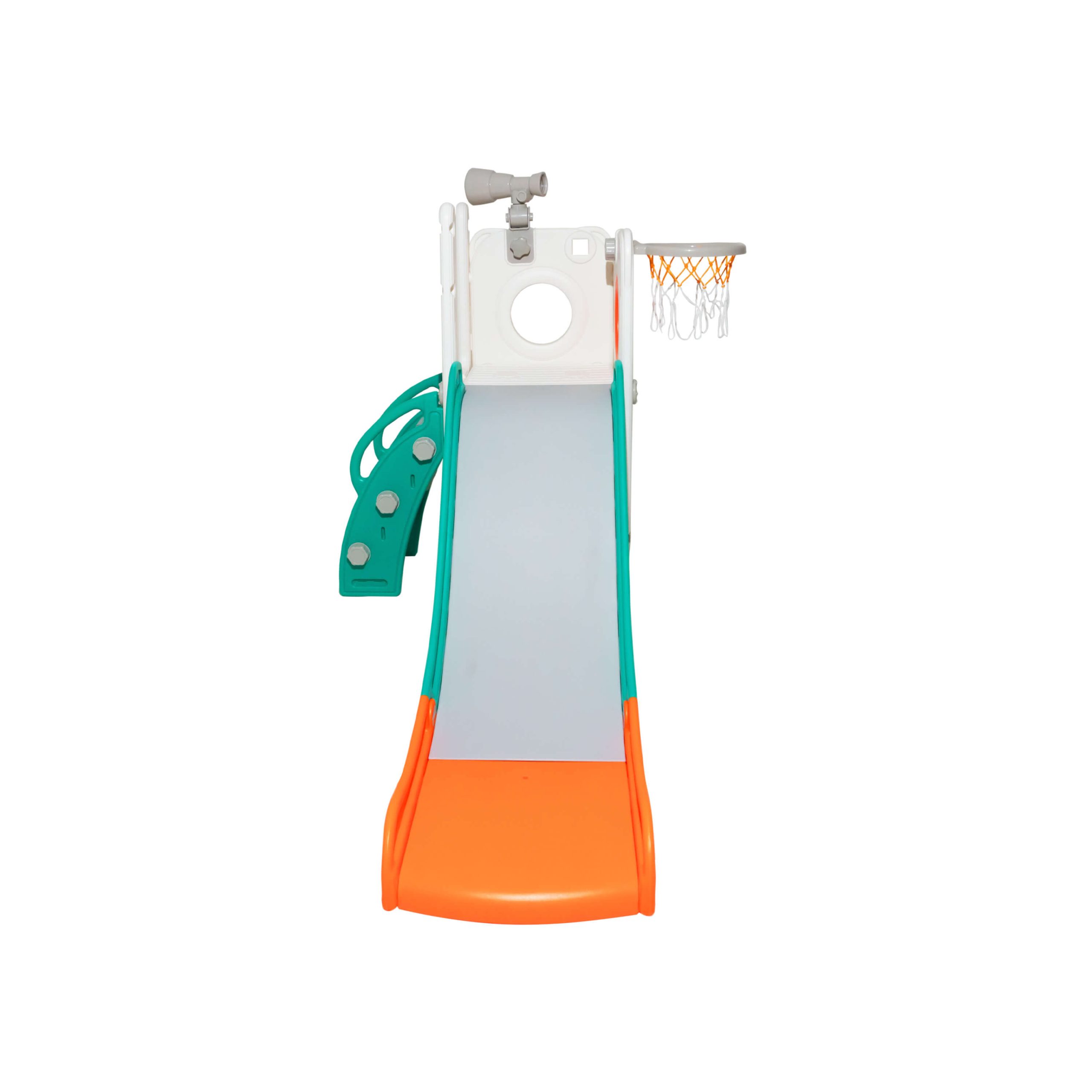 Com 1 torre que inclui escorregador, cesta de basquete, luneta e guarda-brinquedos. Este playground oferece diversas atividades que estimulam a criatividade e o desenvolvimento motor dos pequenos. Feito com materiais de alta qualidade e cantos arredondados, é ideal para ambientes internos e externos e é fácil de montar.