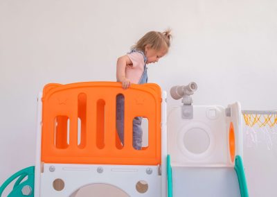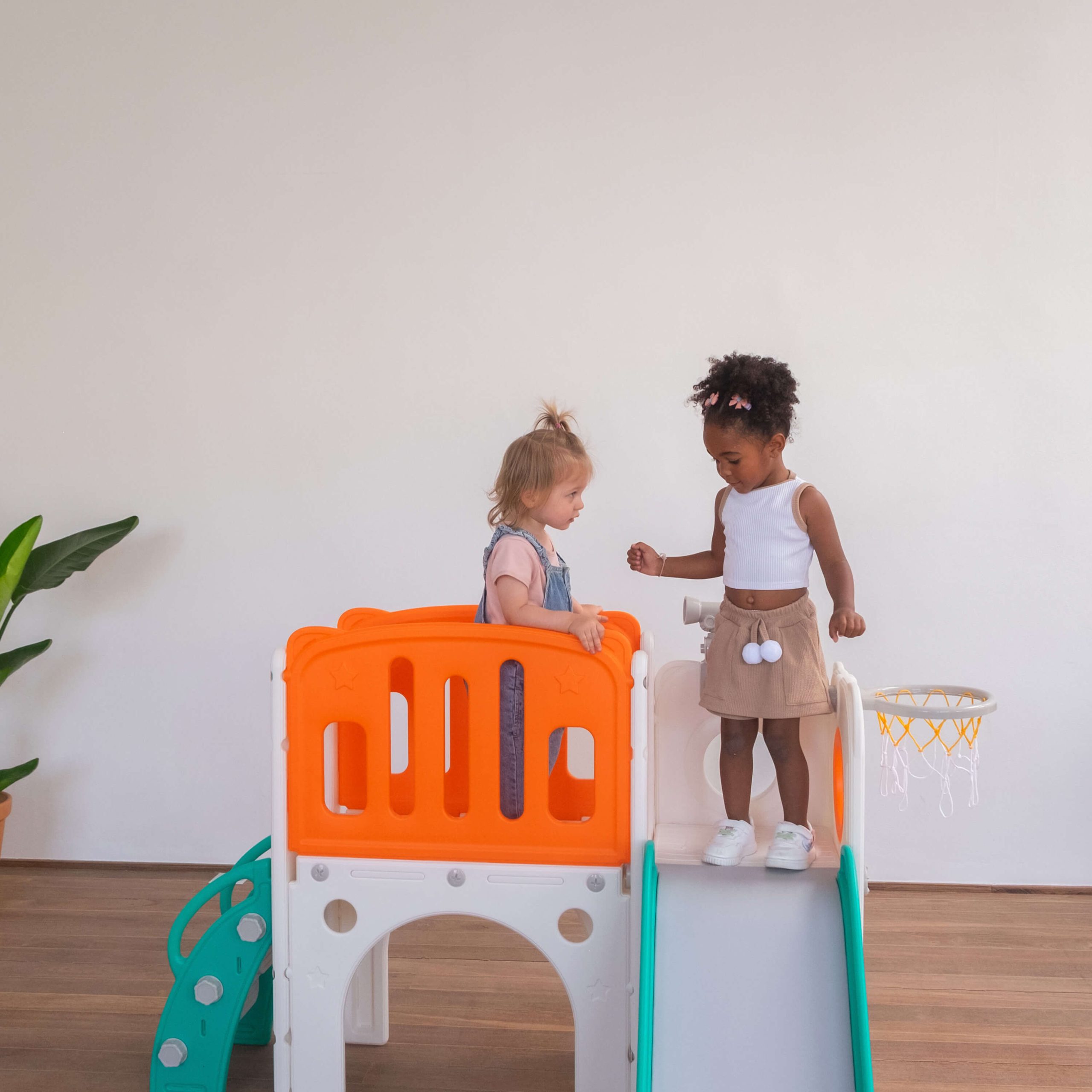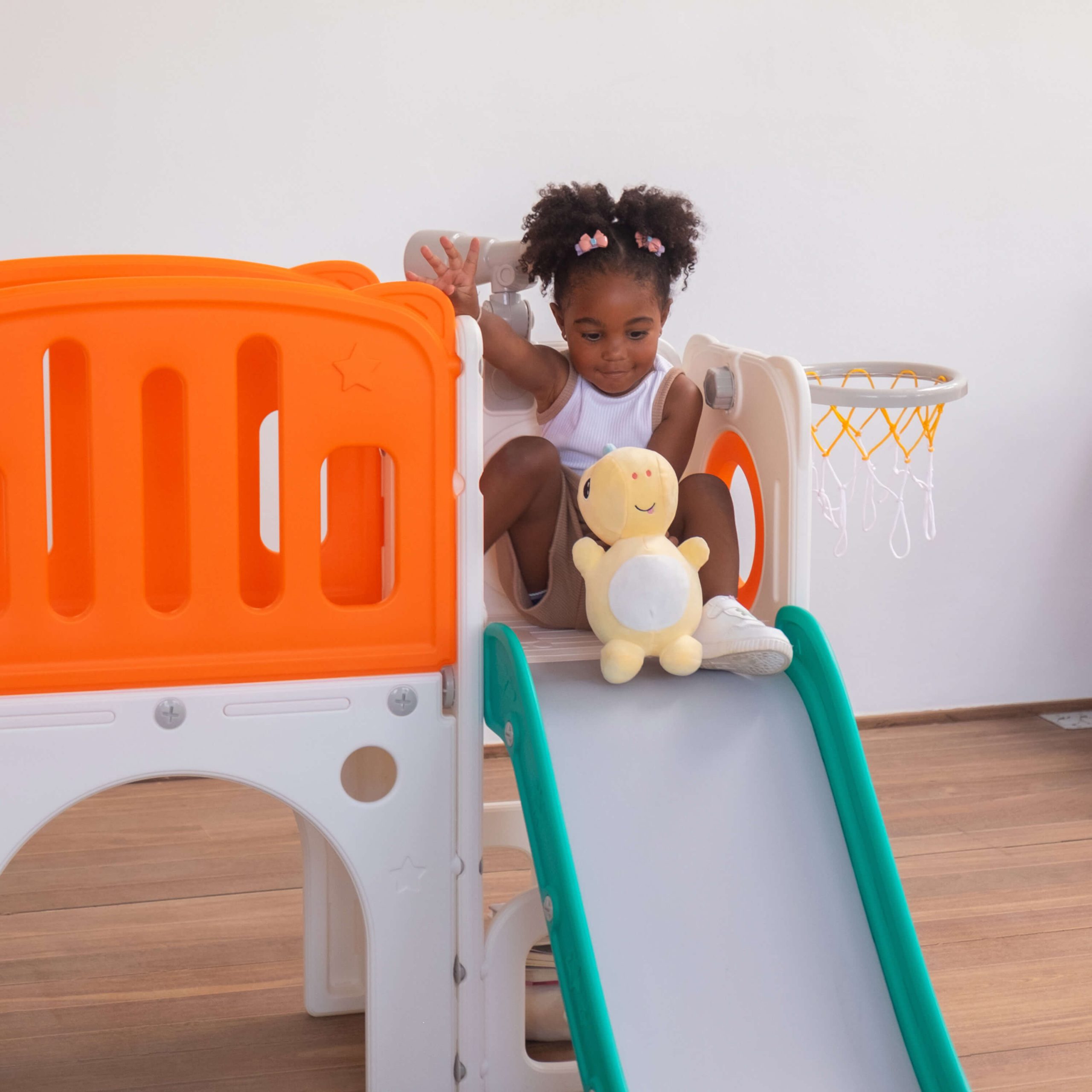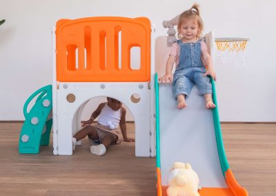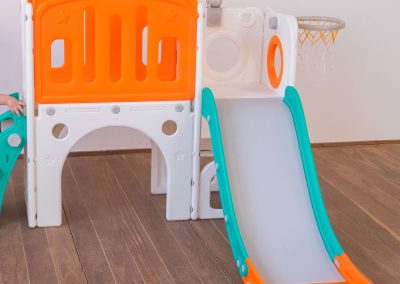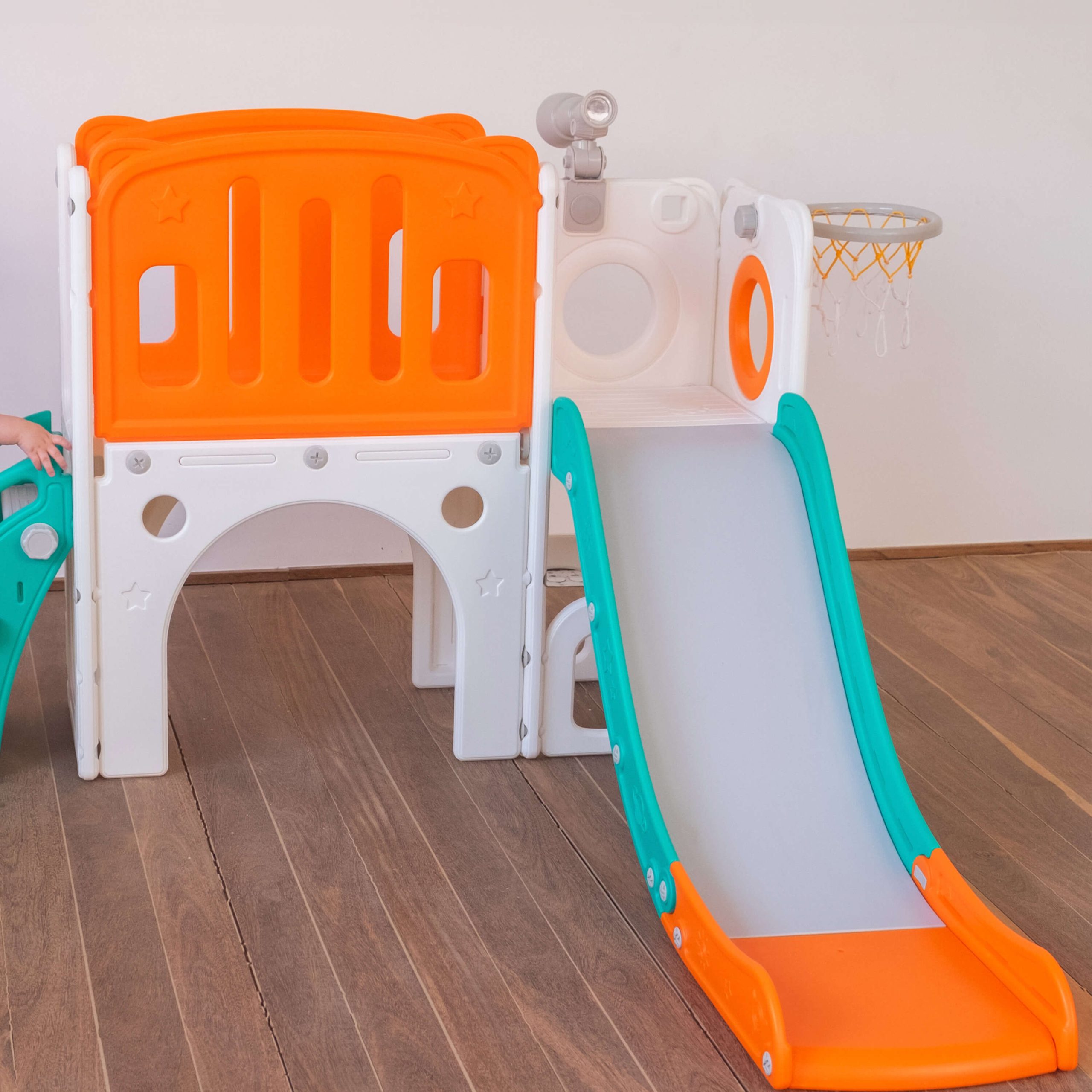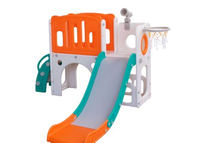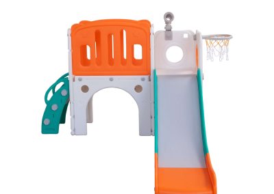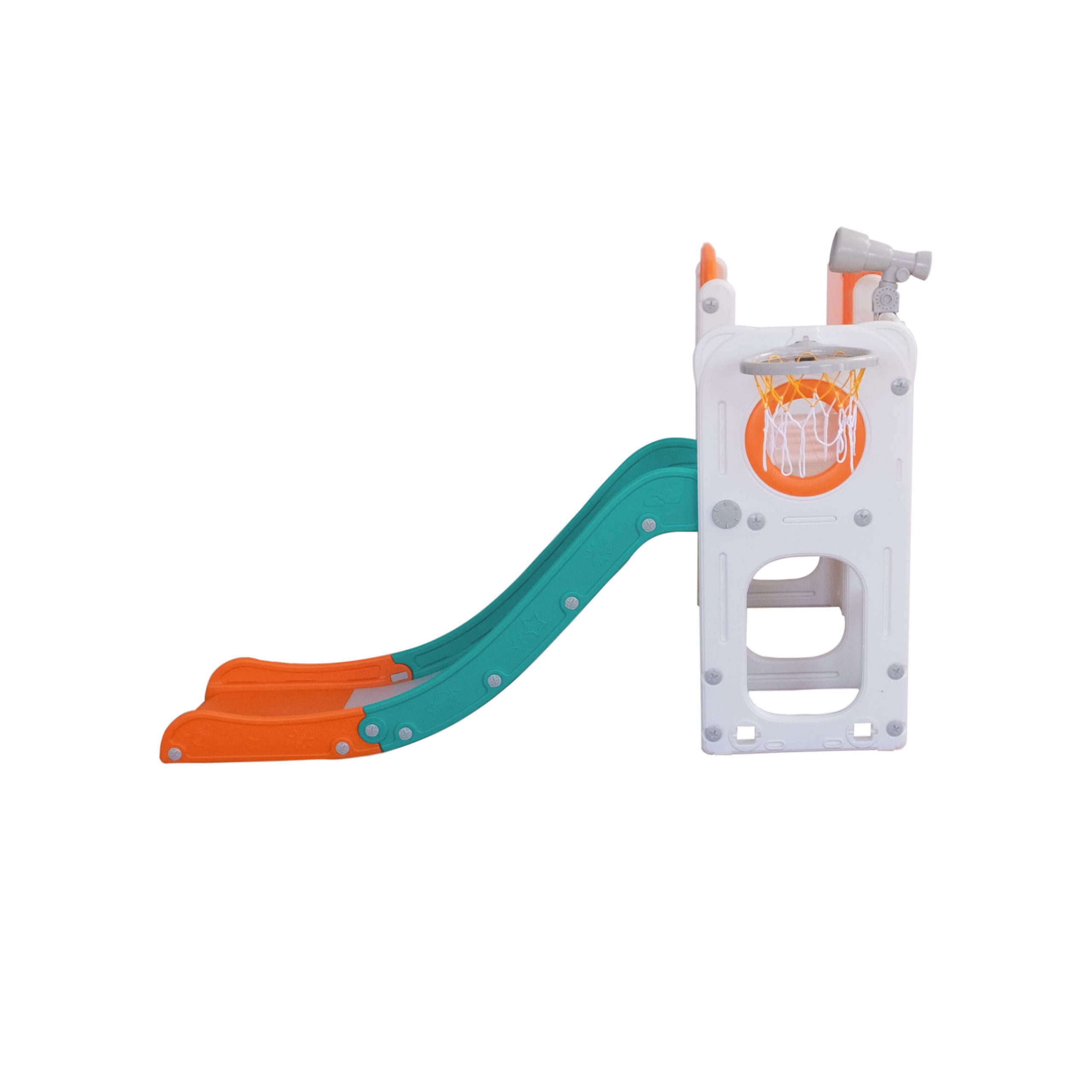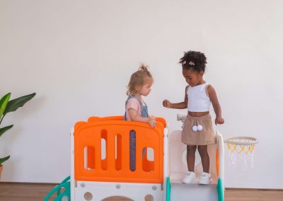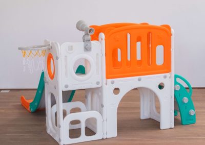 Com 2 torres que incluem escorregador, cesta de basquete, luneta e guarda-brinquedos. Este playground oferece diversas atividades que estimulam a criatividade e o desenvolvimento motor dos pequenos. Feito com materiais de alta qualidade e cantos arredondados, é ideal para ambientes internos e fácil de montar.