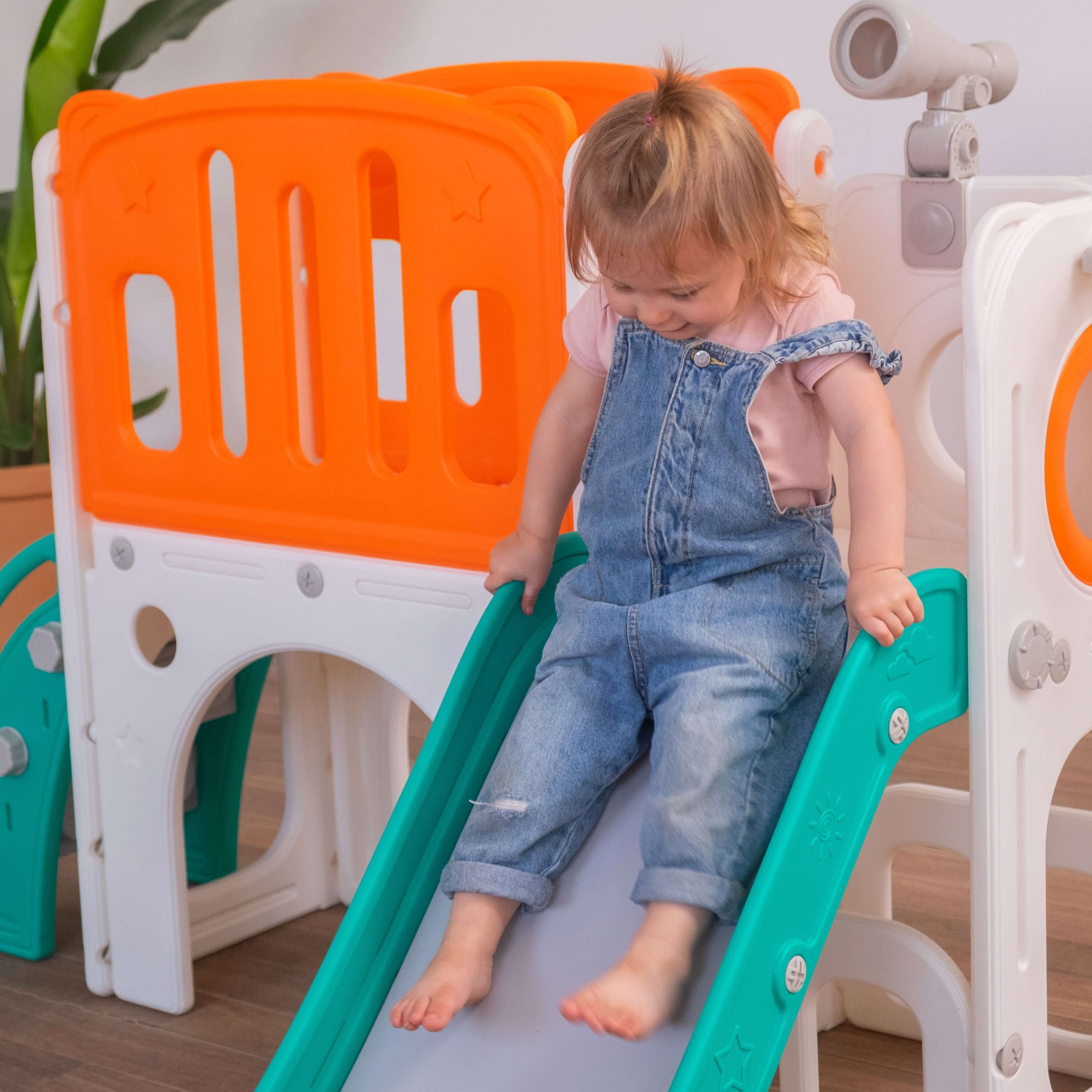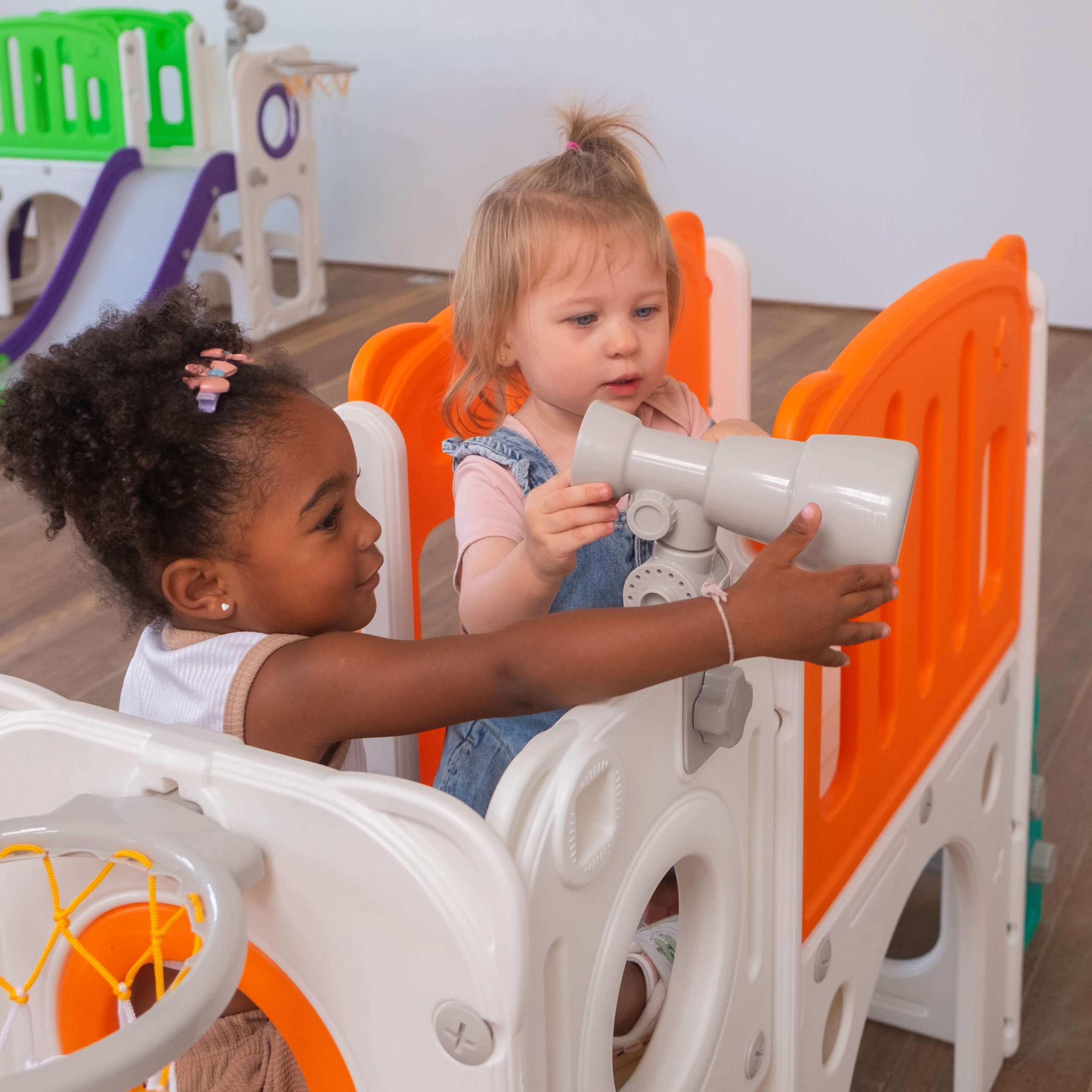 Play Indoor Freso Baby Mini Mundo Spring 2 Torres, Playground Infantil Compacto e Versátil com Escorregador, Cesta de Basquete, Luneta e Atividades Interativas para Crianças Pequenas de 0 a 3 Anos