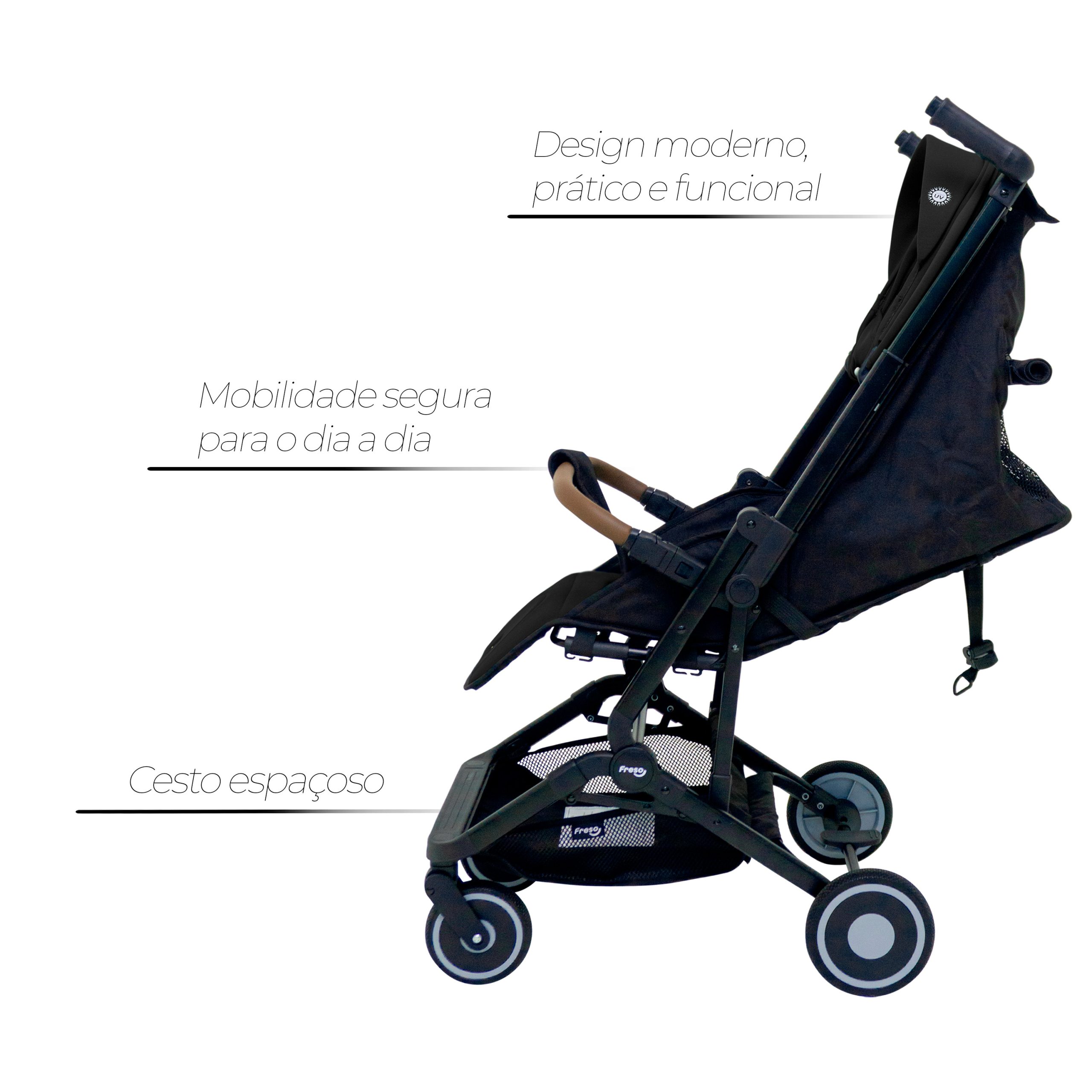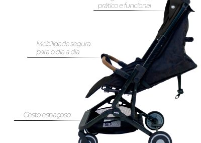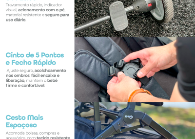 Possui cinto de segurança, freio traseiro e rodas dianteiras giratórias, garantindo mais estabilidade e praticidade nos passeios. Conta ainda com cesto de compras integrado e estrutura resistente, sendo uma opção segura e funcional para a rotina da família.