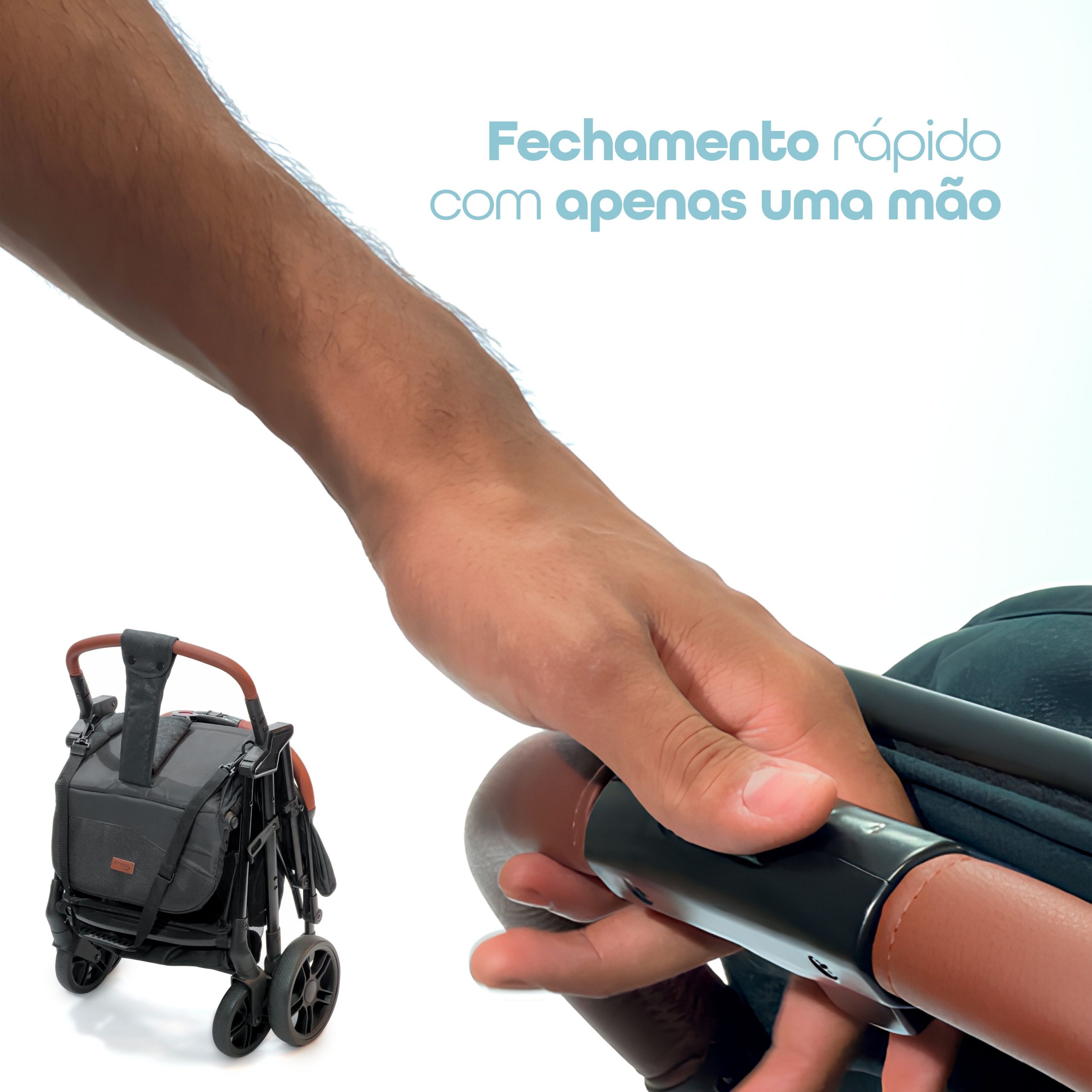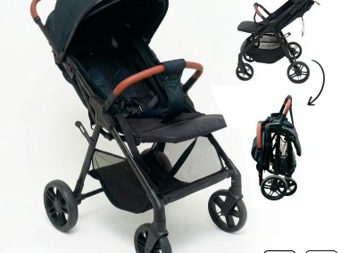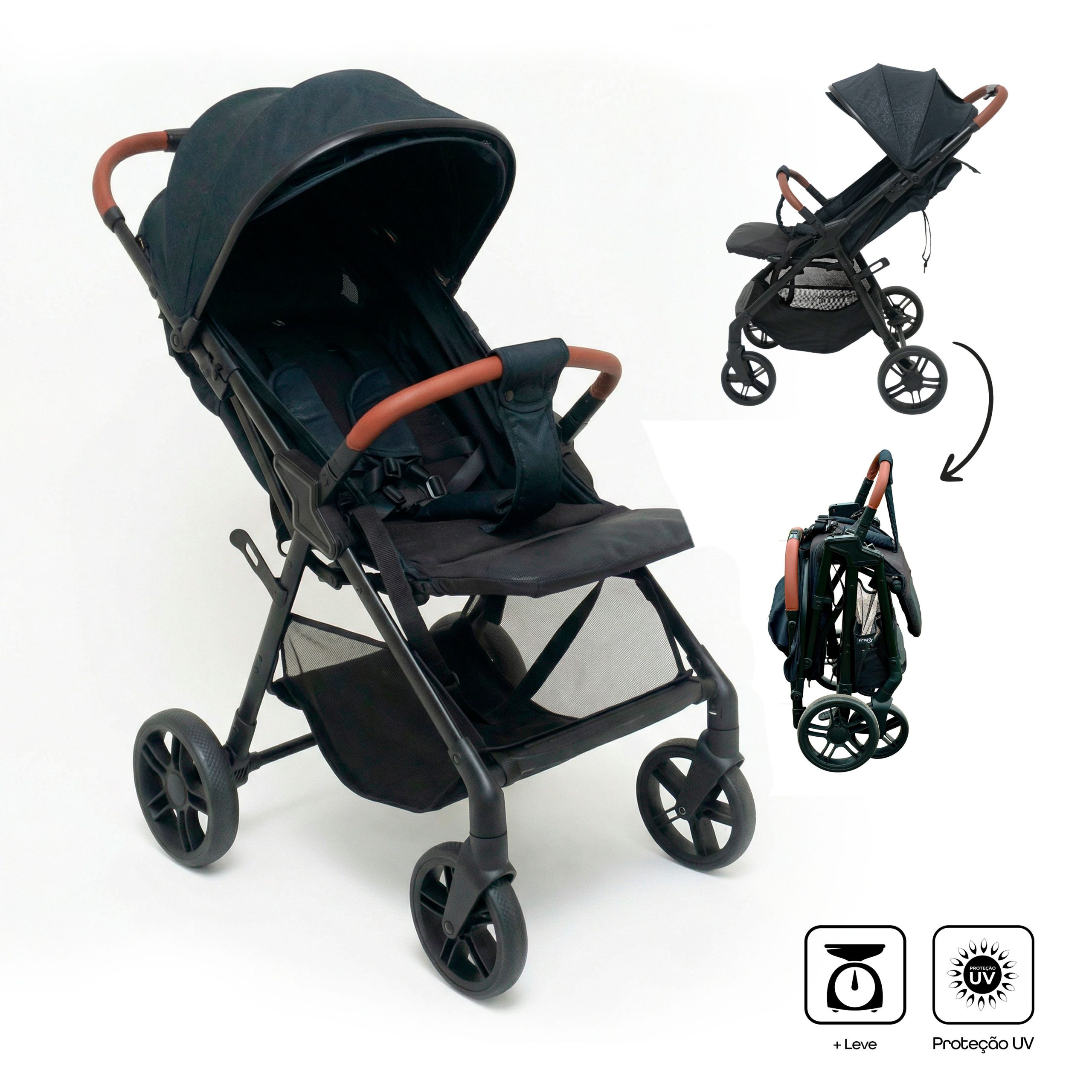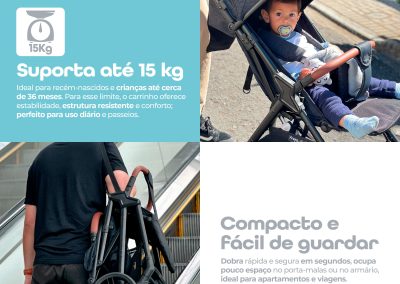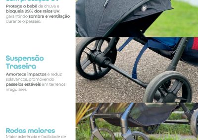 O toldo com proteção UV e visor peek-a-boo com fechamento magnético protegem o bebê do sol e permitem acompanhar o pequeno durante o passeio. Além disso, o carrinho conta com cesto para compras, suporte para copo e alça de transporte, unindo praticidade e estilo.