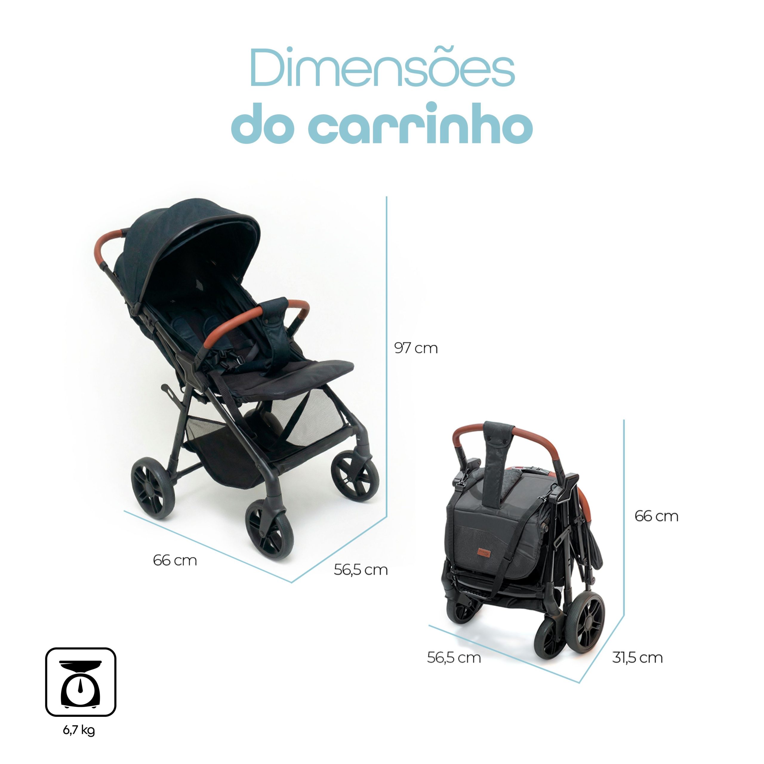 | Dimensões do carrinho fechado (C x L x A): | 56,5 cm x 31,5 cm x 66 cm |