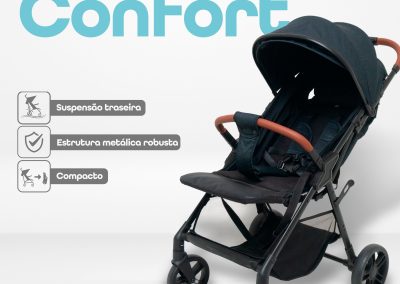 Com assento reclinável até 150°, cinto de 5 pontos, freio duplo e suspensão nas rodas traseiras, o Confort garante estabilidade e segurança em todos os tipos de passeio. O toldo com proteção UV e visor peek-a-boo magnético protege o bebê do sol e permite acompanhar o pequeno com facilidade.