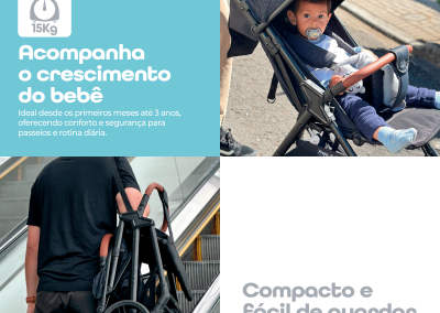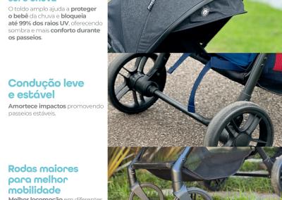 Seu fechamento prático permite guardar e transportar com facilidade, sendo uma excelente opção para quem busca um carrinho de bebê compacto para passeio e viagem.