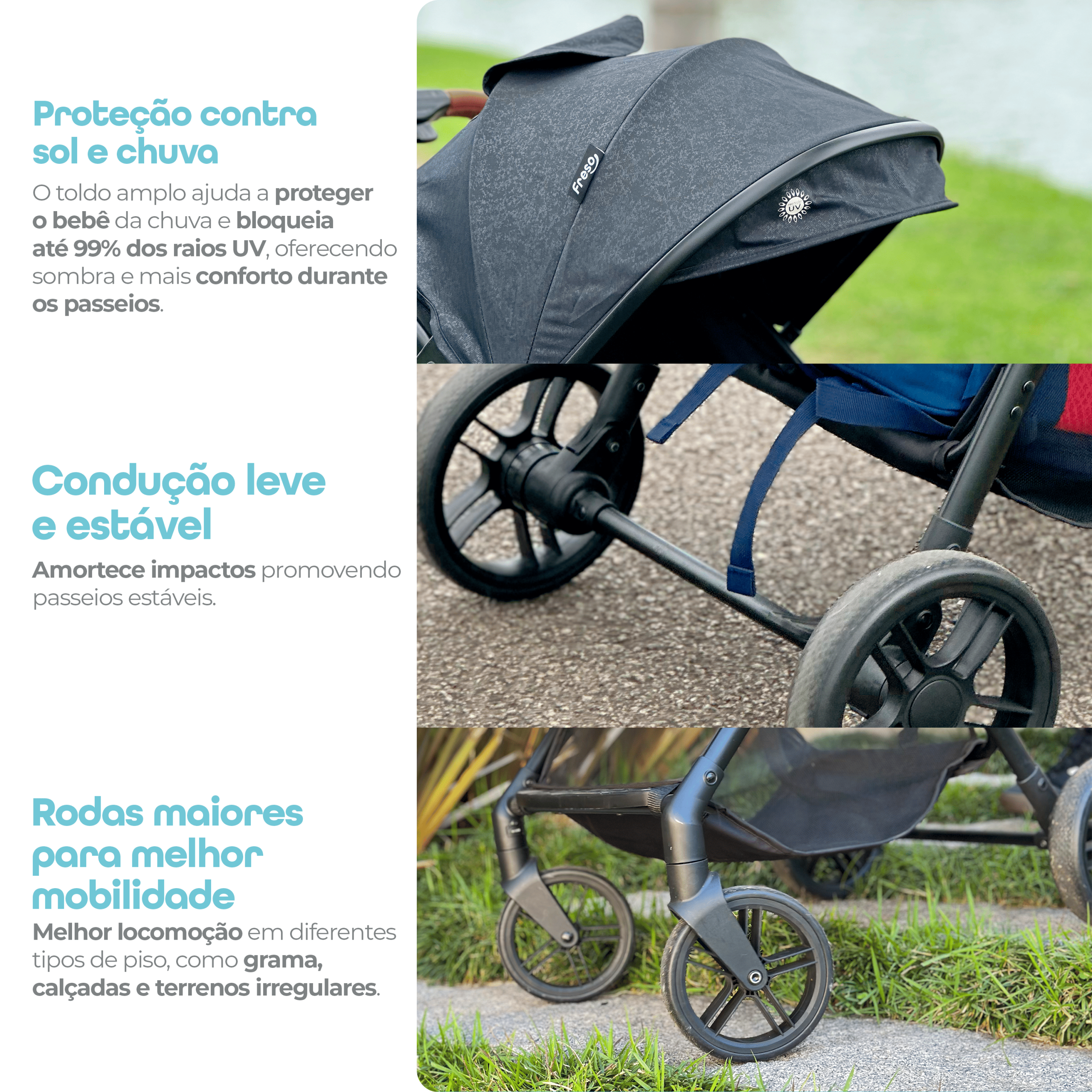 Carrinho de Bebê para Viagem Freso Confort, compacto, leve e dobrável, com estrutura resistente e rodas maiores para mais estabilidade. Seguro, confortável e fácil de transportar no dia a dia, ideal para passeios e viagens com crianças de 0 a 3 anos