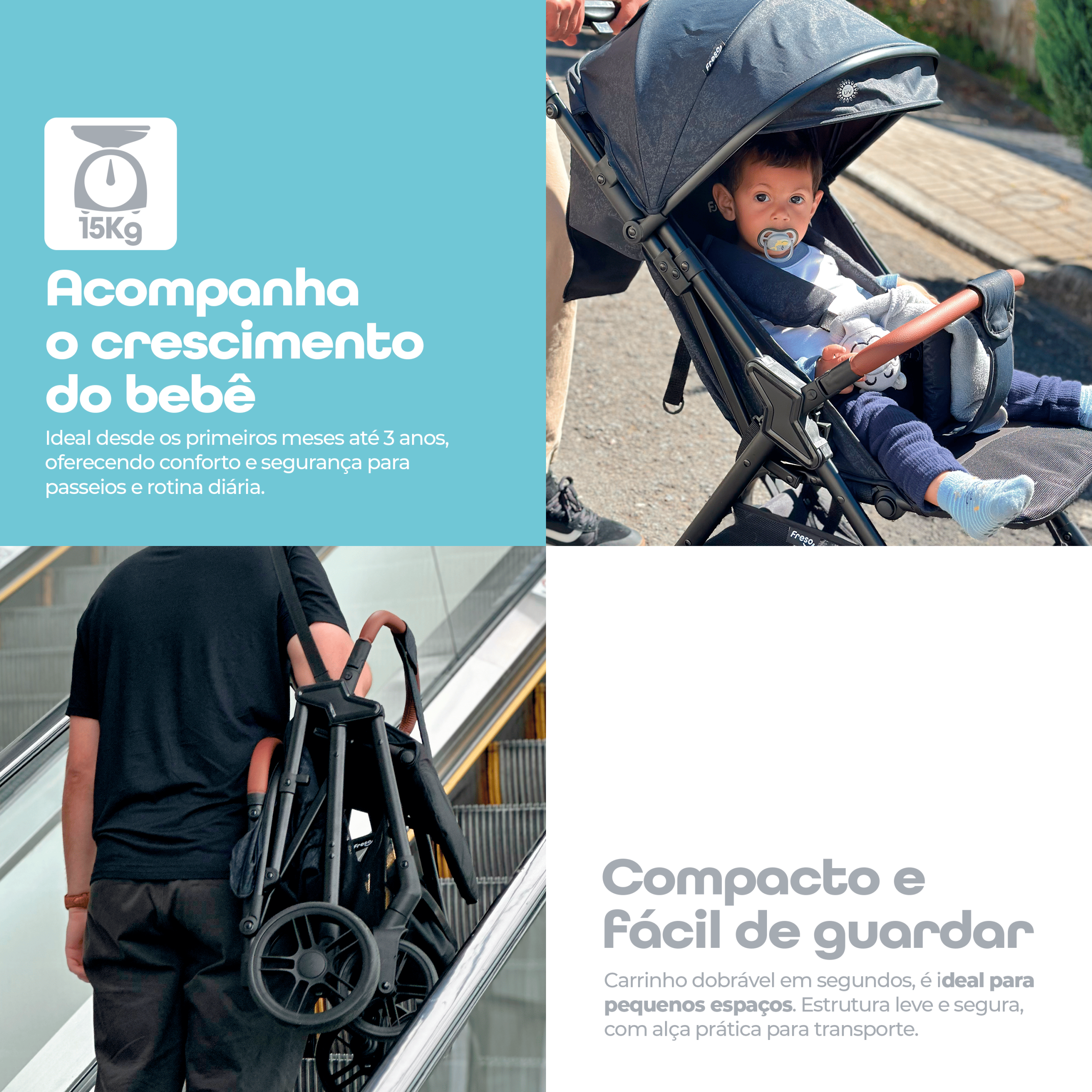 O Carrinho de Bebê Freso Confort é compacto, leve e dobrável, ideal para passeios e viagens. Indicado para recém-nascidos até 3 anos, possui fechamento prático, facilitando o armazenamento em porta-malas pequenos, armários e bagageiros de avião.