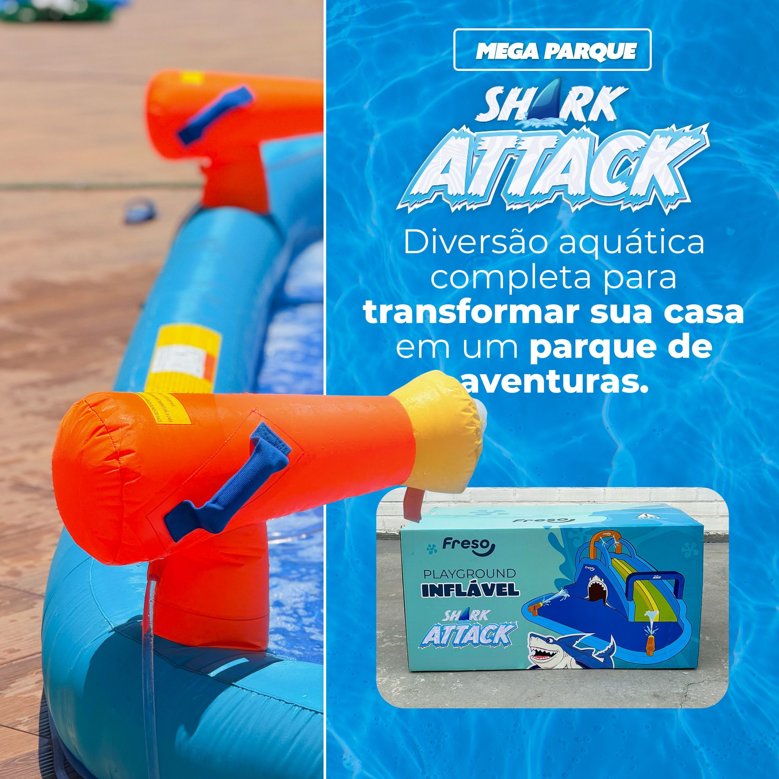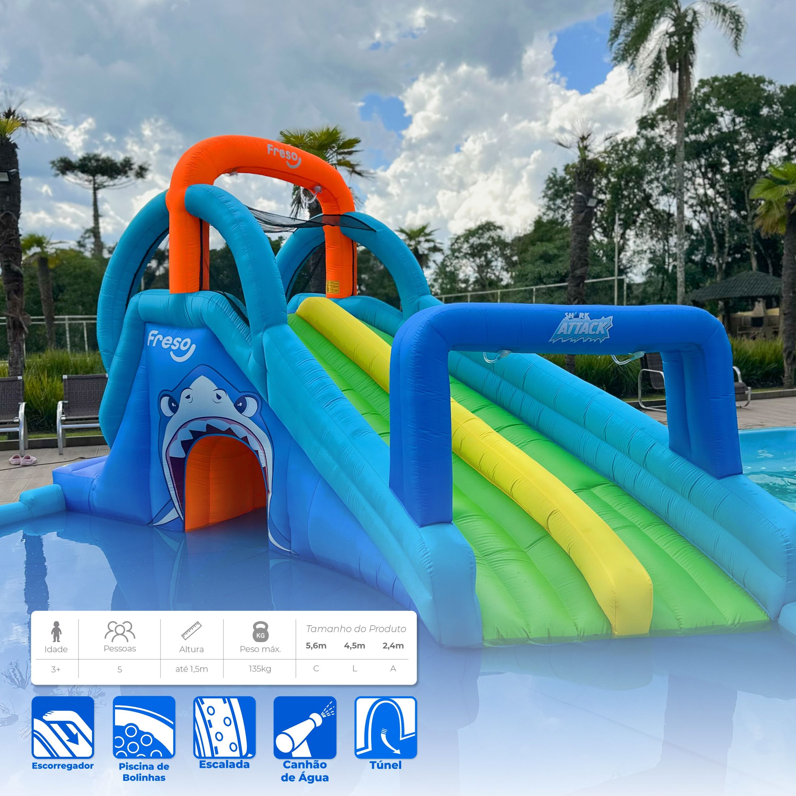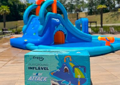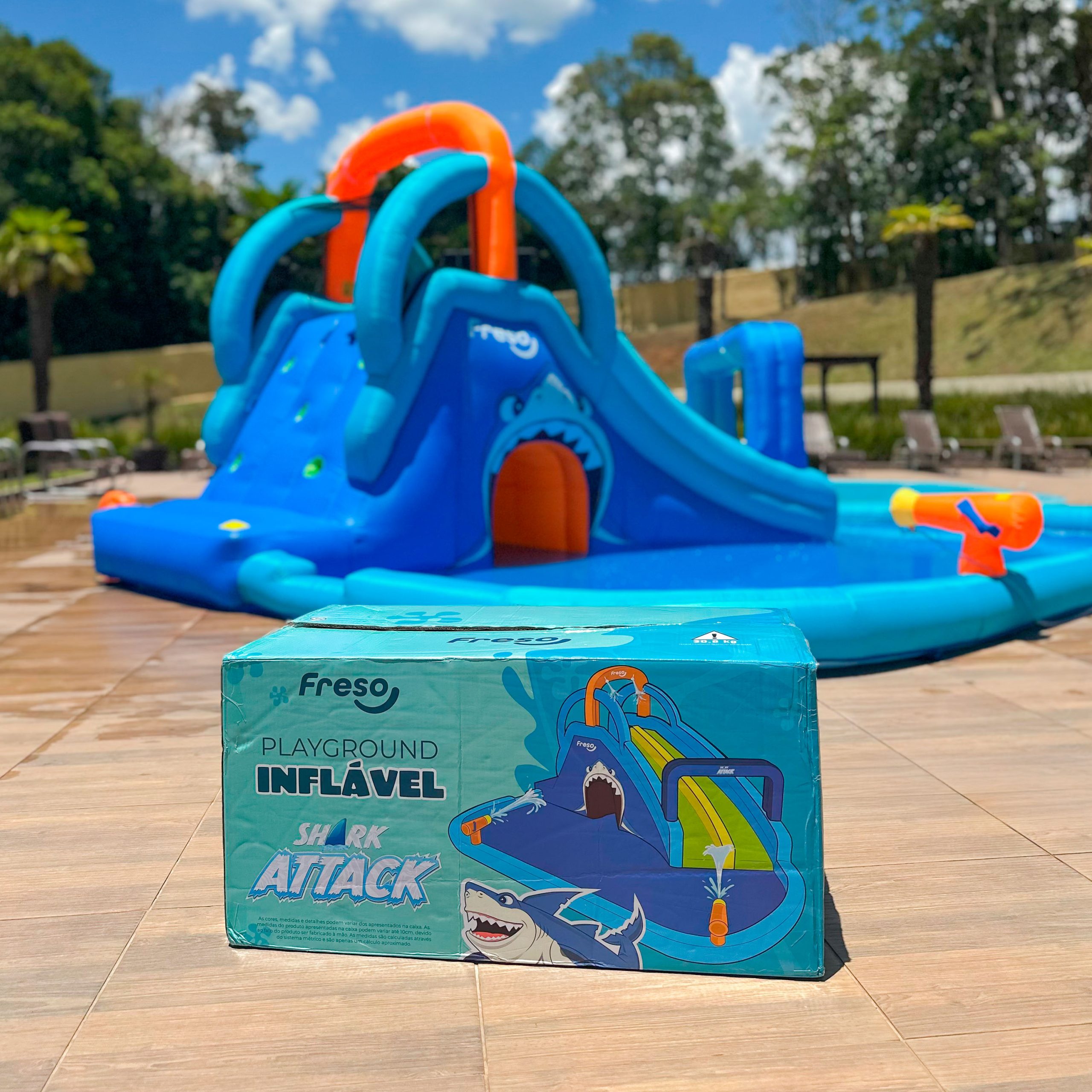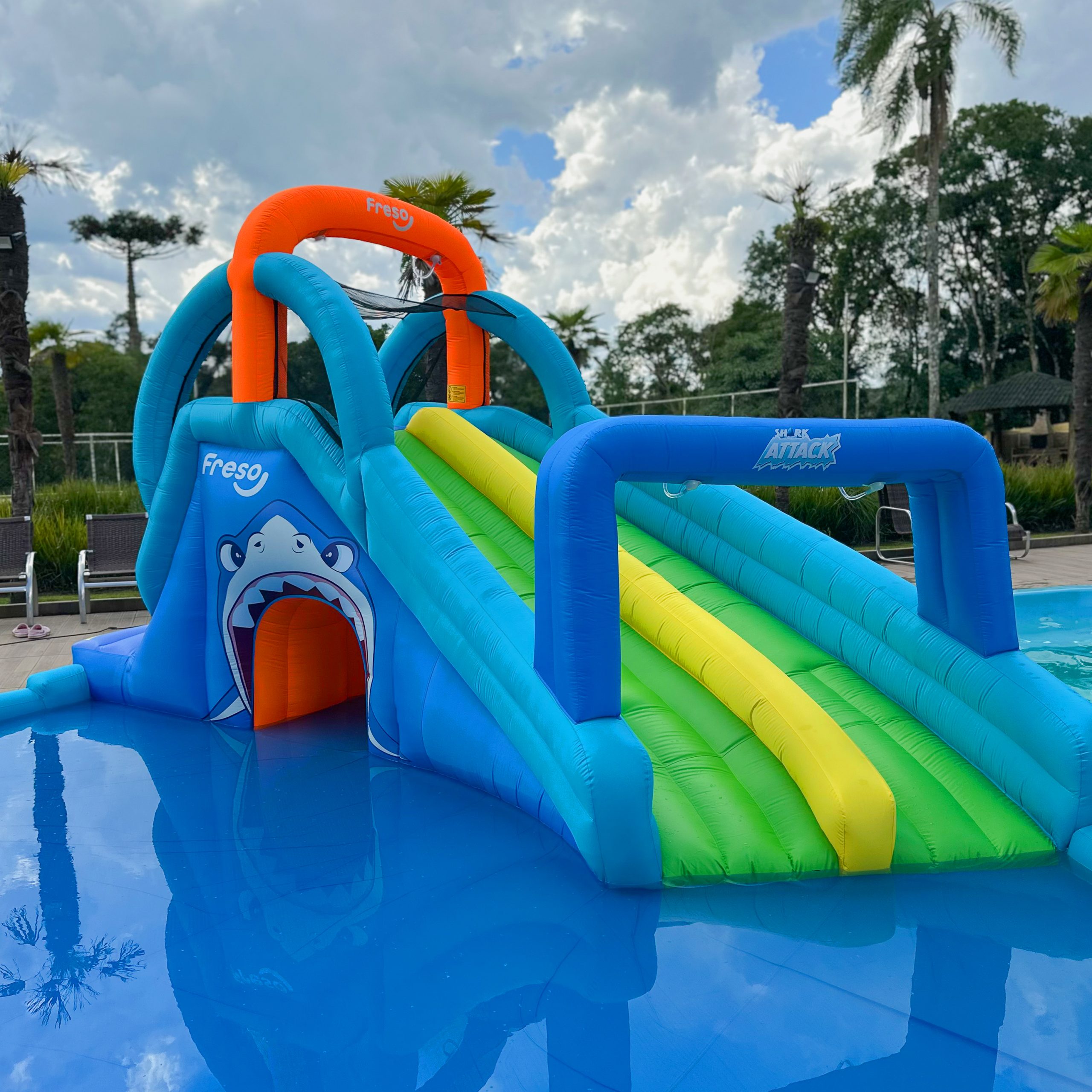 O Playground Inflável Shark Attack Freso foi criado para crianças que amam aventura, água e movimento. Um escorregador inflável infantil com piscina integrada que leva a experiência de um verdadeiro parque aquático inflável diretamente para o quintal, festas infantis, férias escolares, chácaras e diversas ocasiões, tornando os dias quentes ainda mais divertidos. Com capacidade para até 800 litros de água e profundidade aproximada de 5 cm, é perfeito para crianças de 3 a 10 anos.