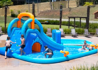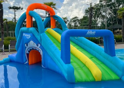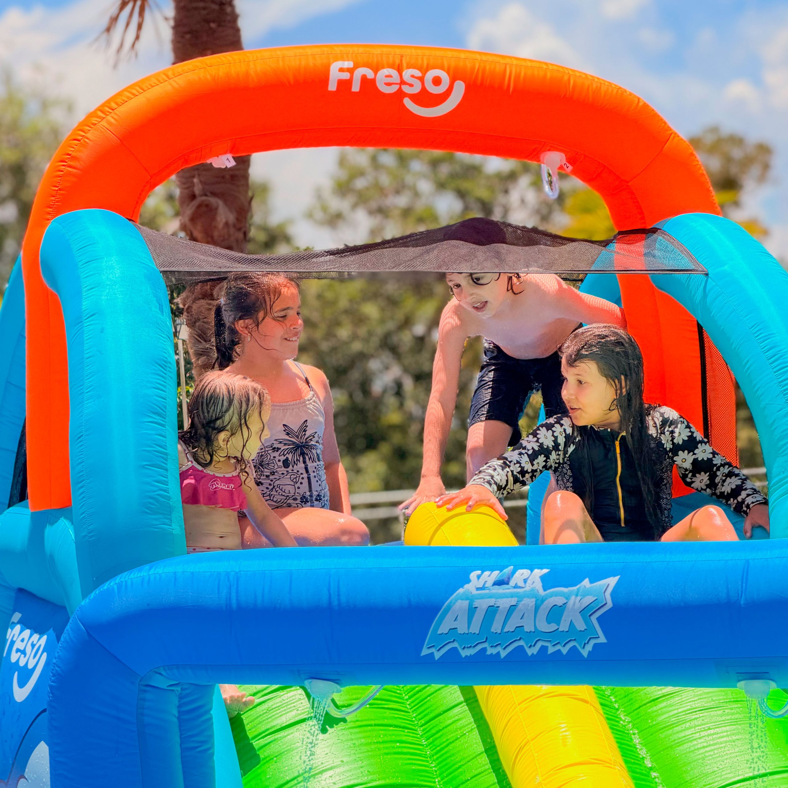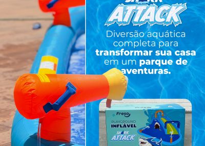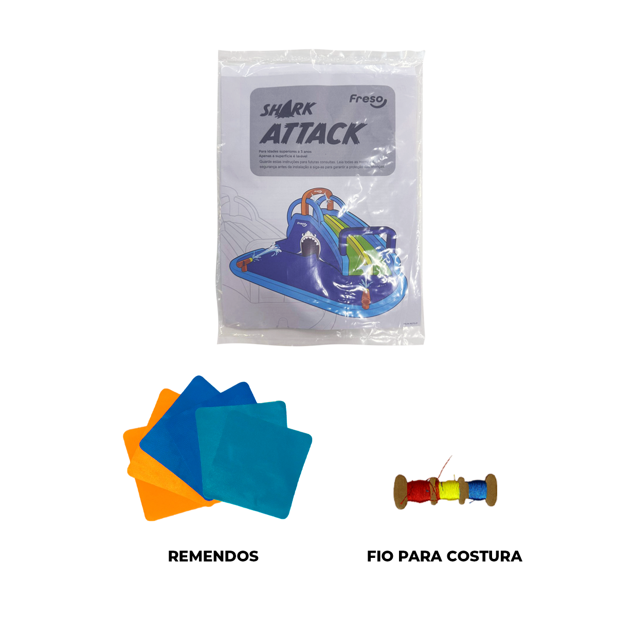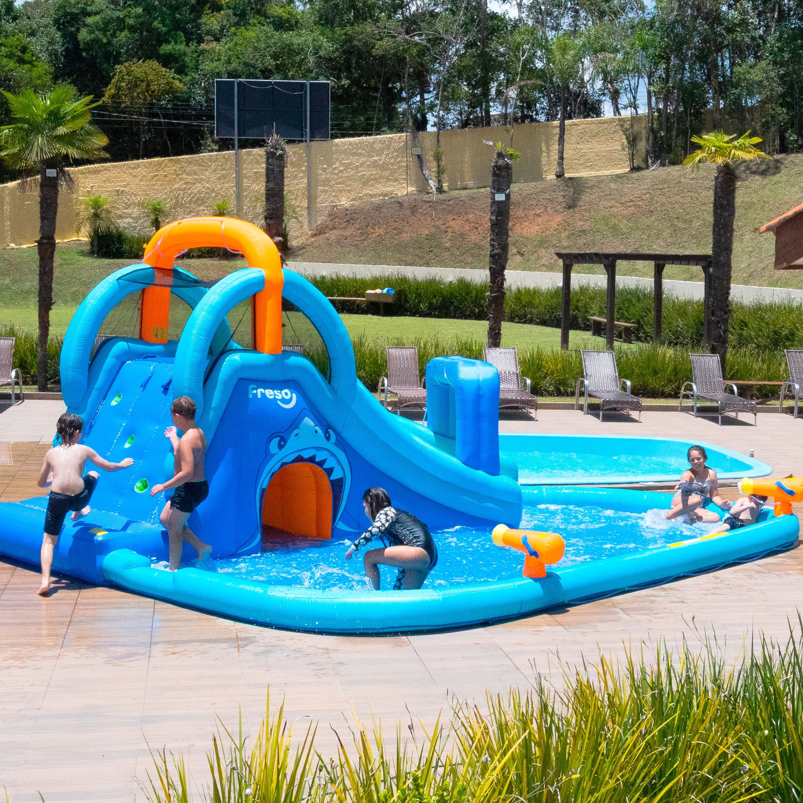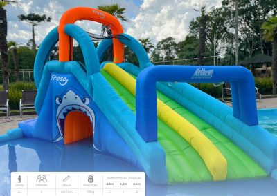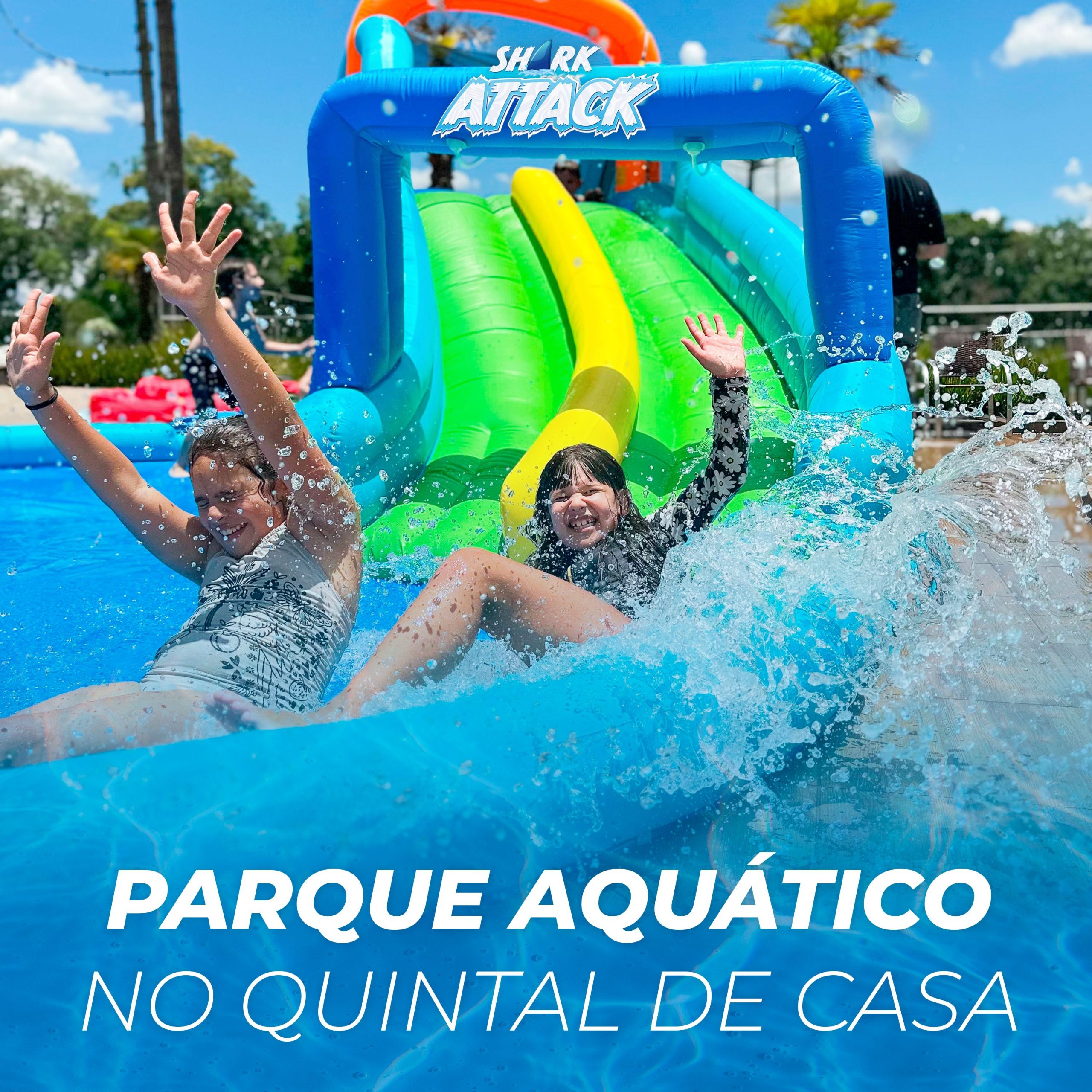 O Playground Inflável Shark Attack Freso foi criado para crianças que amam aventura, água e movimento. Um escorregador inflável infantil com piscina integrada que leva a experiência de um verdadeiro parque aquático inflável diretamente para o quintal, festas infantis, férias escolares, chácaras e diversas ocasiões, tornando os dias quentes ainda mais divertidos. Com capacidade para até 800 litros de água e profundidade aproximada de 5 cm, é perfeito para crianças de 3 a 10 anos.