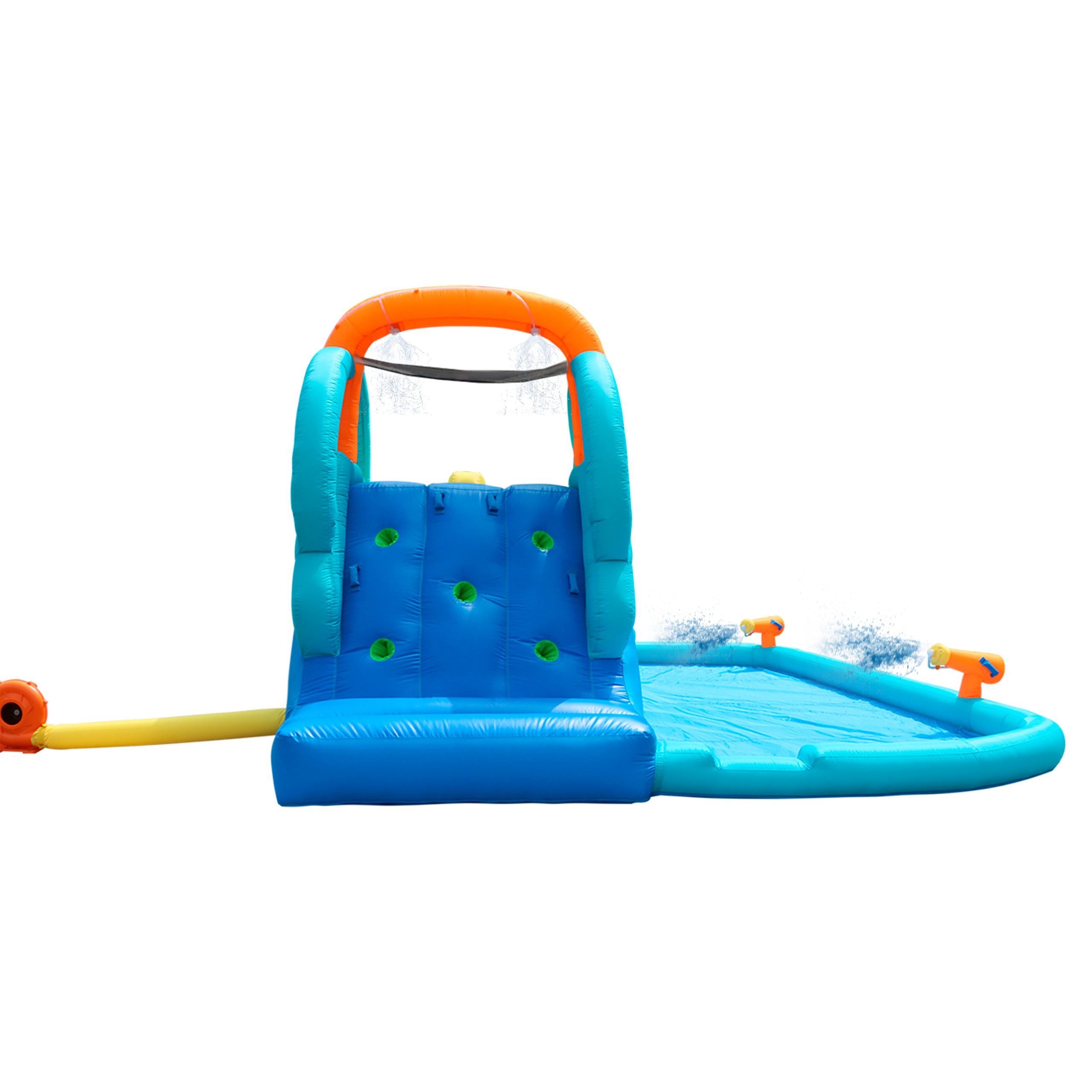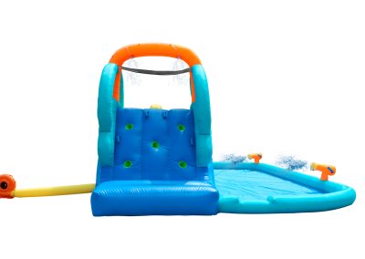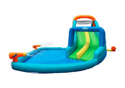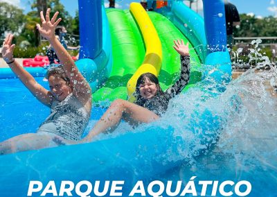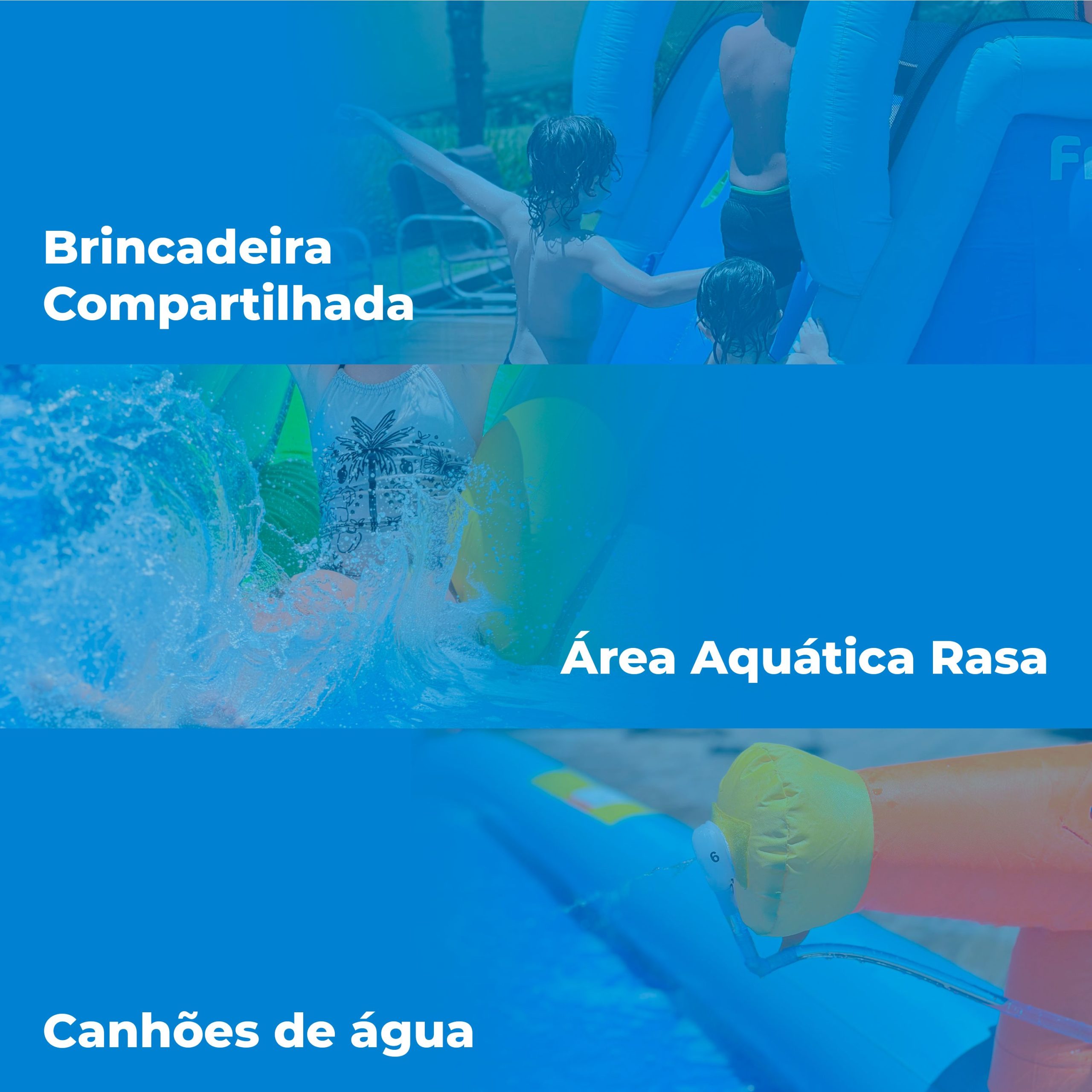 O inflável acompanha soprador potente (motor incluso), inflando o parque aquático entre 2 e 5 minutos. Também conta com bolsa para transporte, estacas para fixação no solo e kit para pequenos reparos, oferecendo praticidade, resistência e segurança para uso frequente.