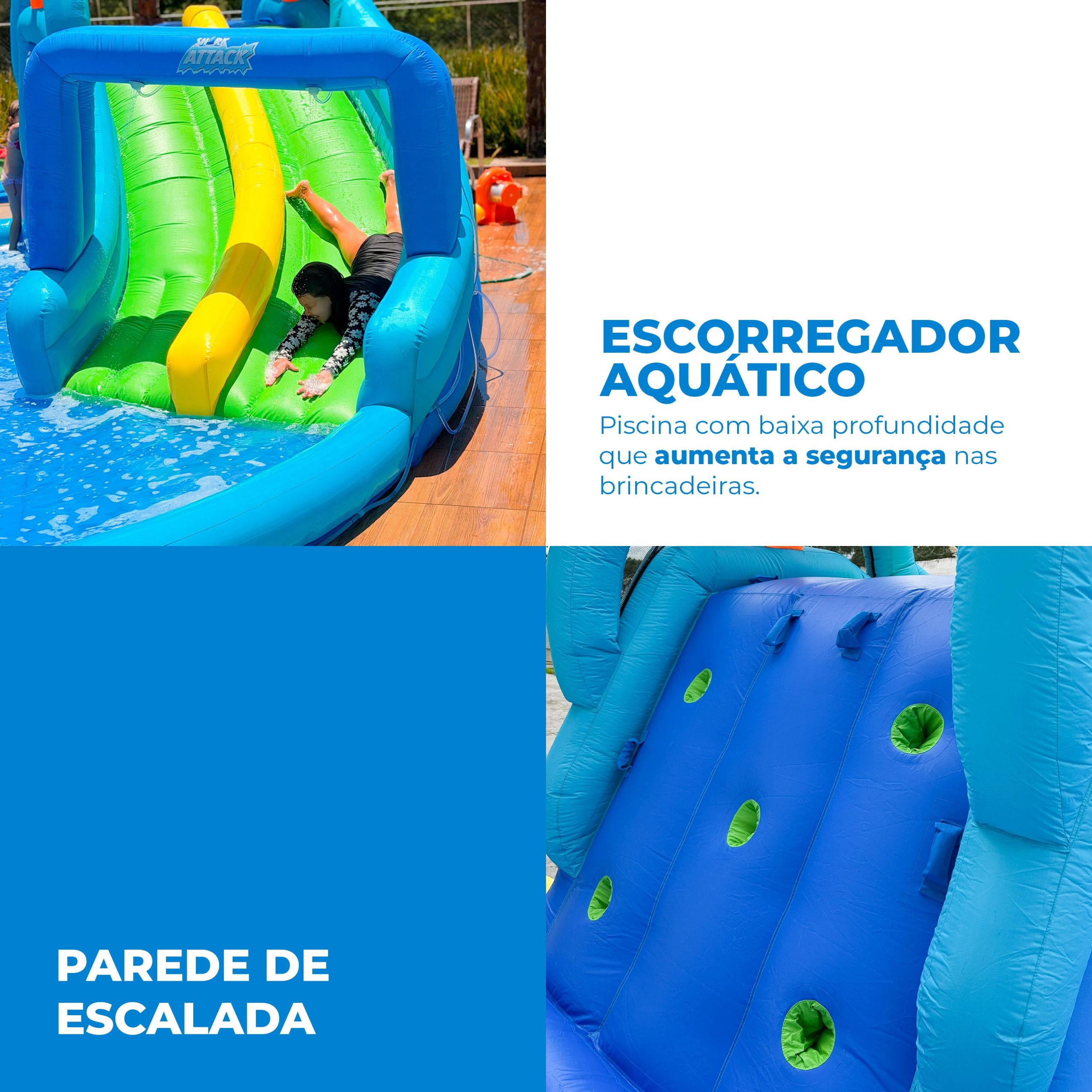 Os 2 esguichos de água deixam a brincadeira ainda mais refrescante, garantindo momentos de pura adrenalina e muitas risadas. Com escorregador duplo, escalada e muita água, o Shark Attack é o convite perfeito para a criançada gastar energia e soltar a imaginação em uma experiência completa de diversão infantil.