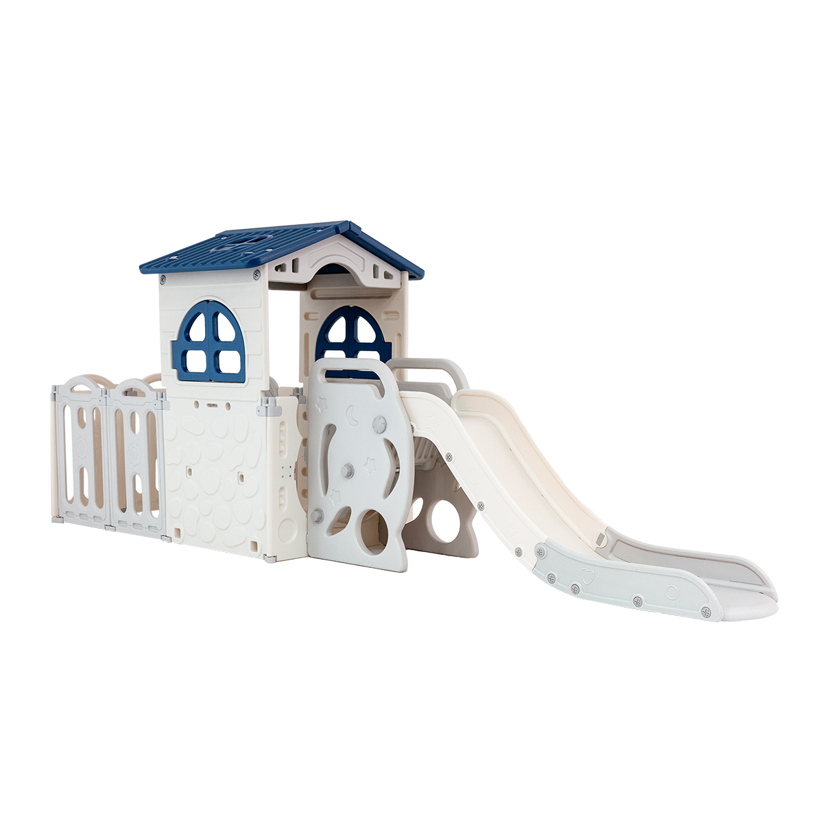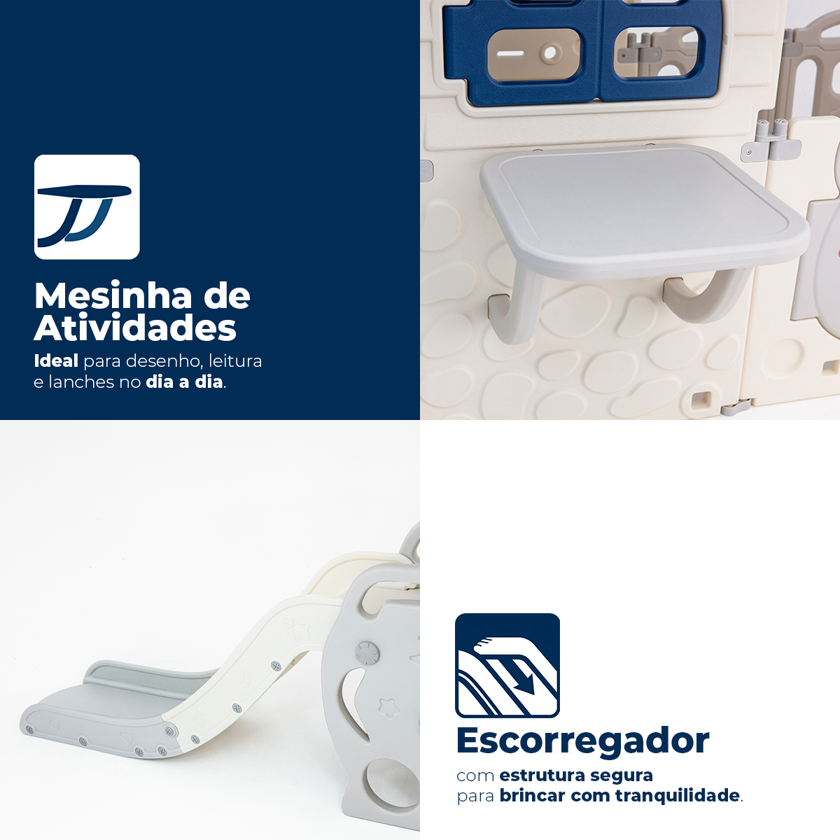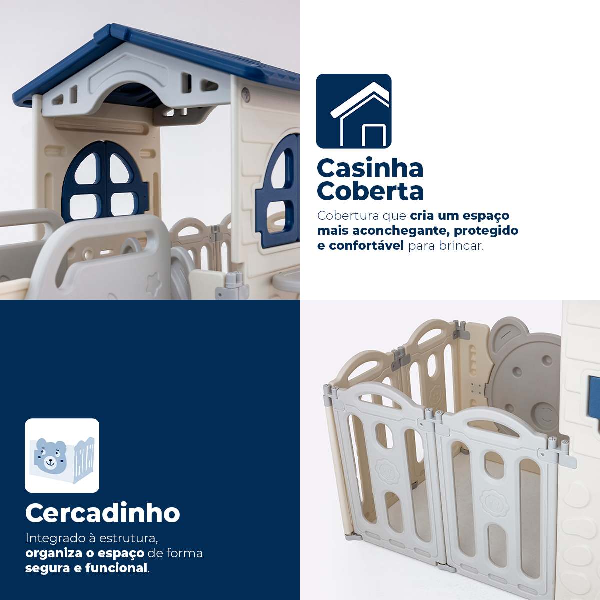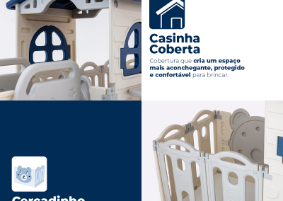 Com estrutura segura e resistente, reúne casinha, escorregador e cercadinho em um único playground infantil, garantindo diversão com mais segurança no dia a dia.