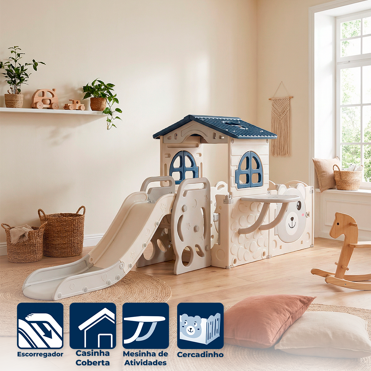 Brinquedo Infantil Playground com Escorregador e Casinha Urso com Cercadinho Freso para Crianças Estrutura Segura Resistente e Fácil Montagem Ideal para Uso Interno Proporciona Diversão Estimula o Desenvolvimento Motor Coordenação e Criatividade