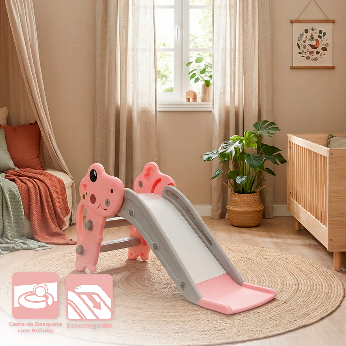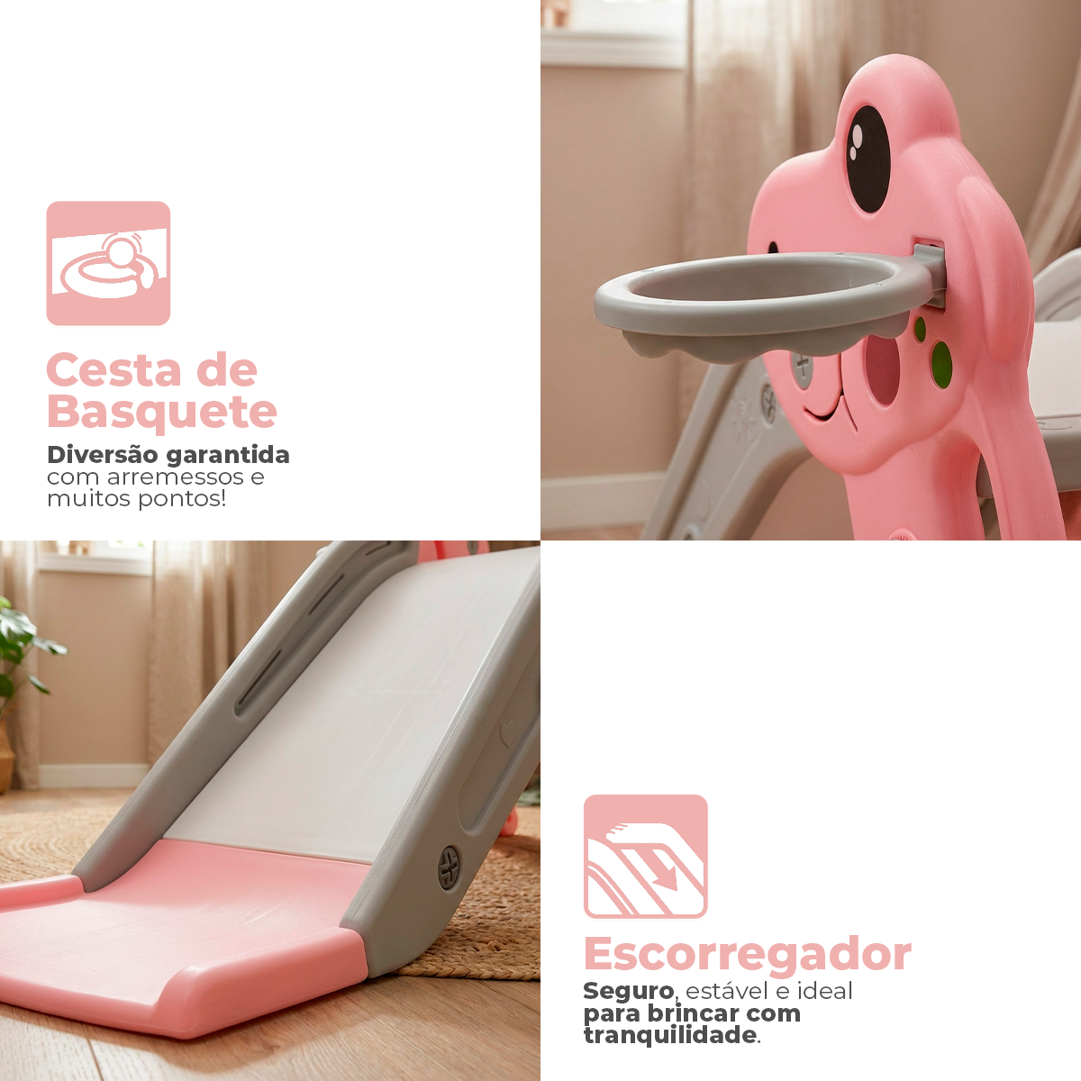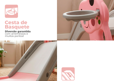 • Cesta de basquete – Acoplado no escorregador acompanha bolinha para mais horas de diversão;